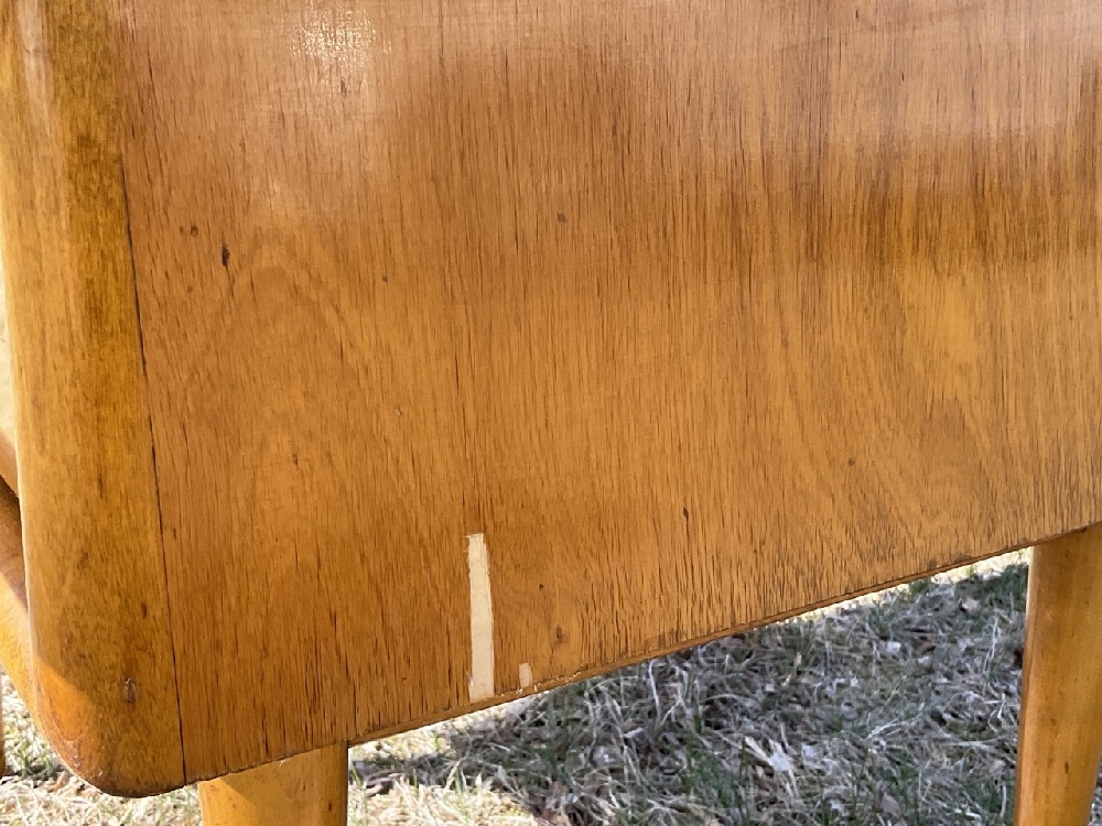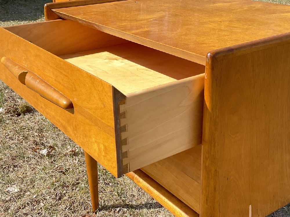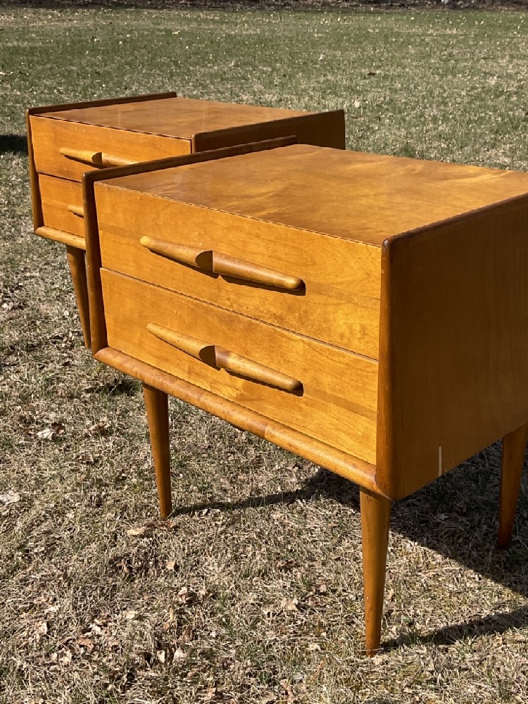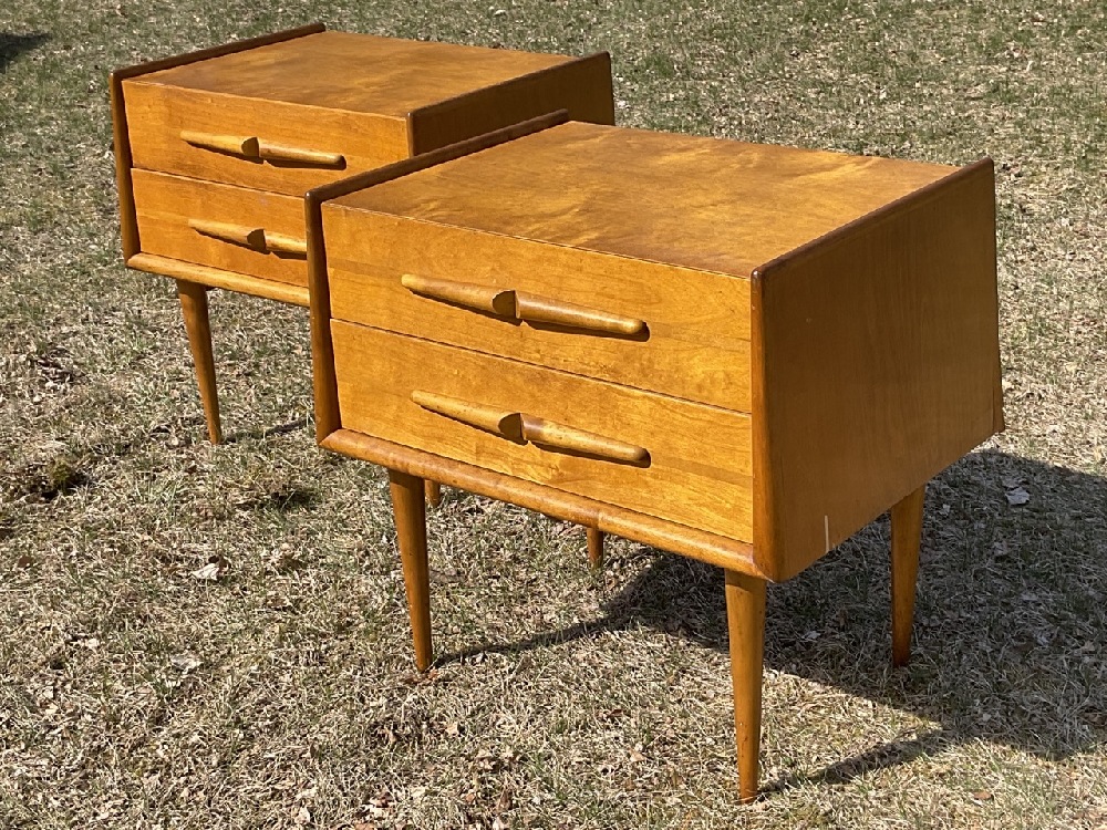A pair of Edmund Spence MCM bedside night stands. Some veneer chipping and loss noted. Please see photograph preview. Purchased from Modernage, c.1950's