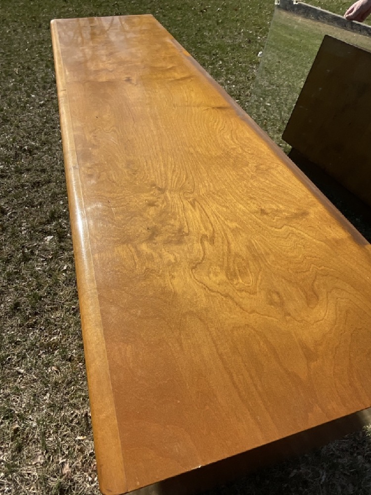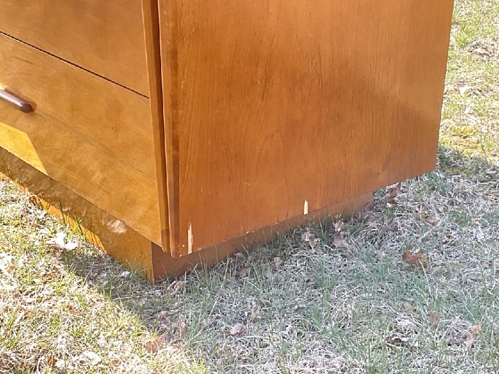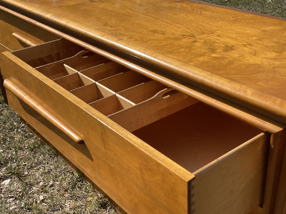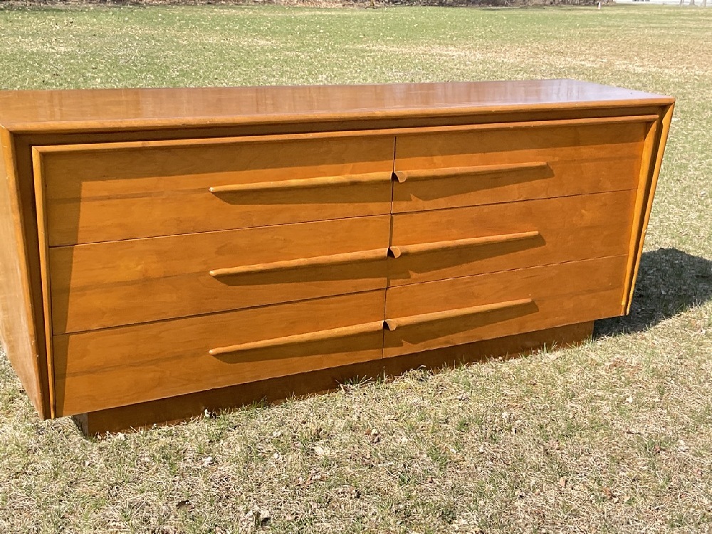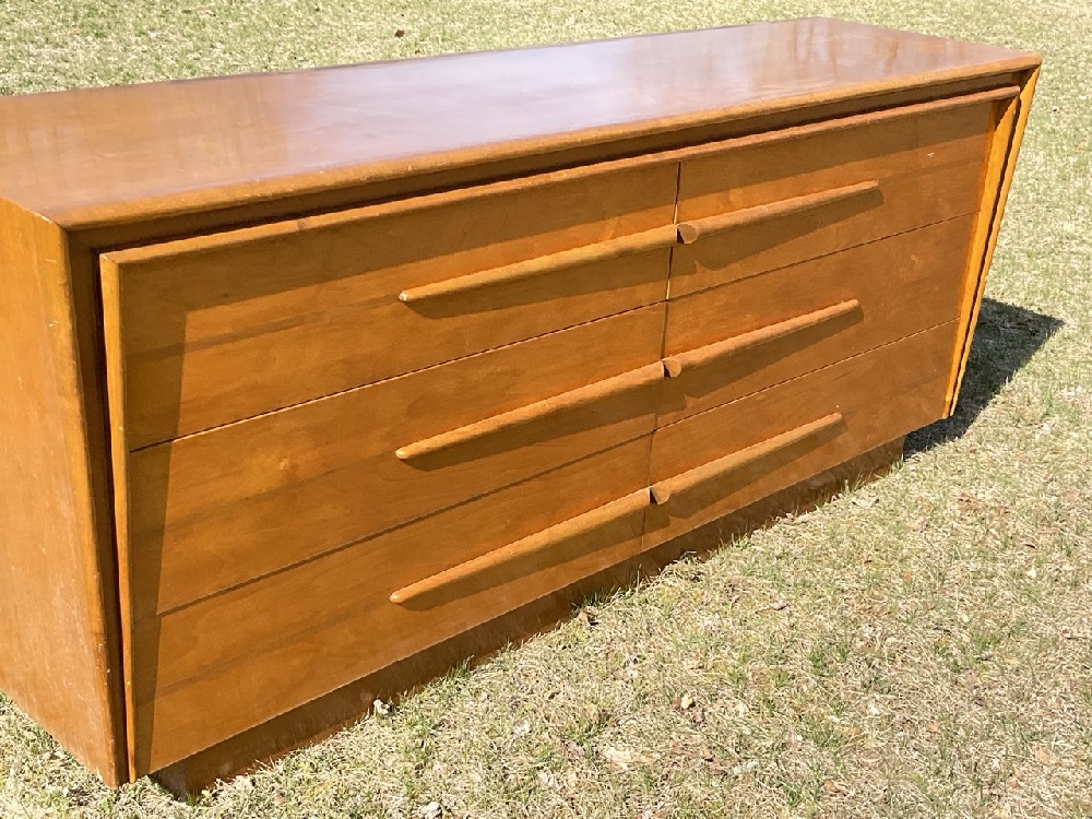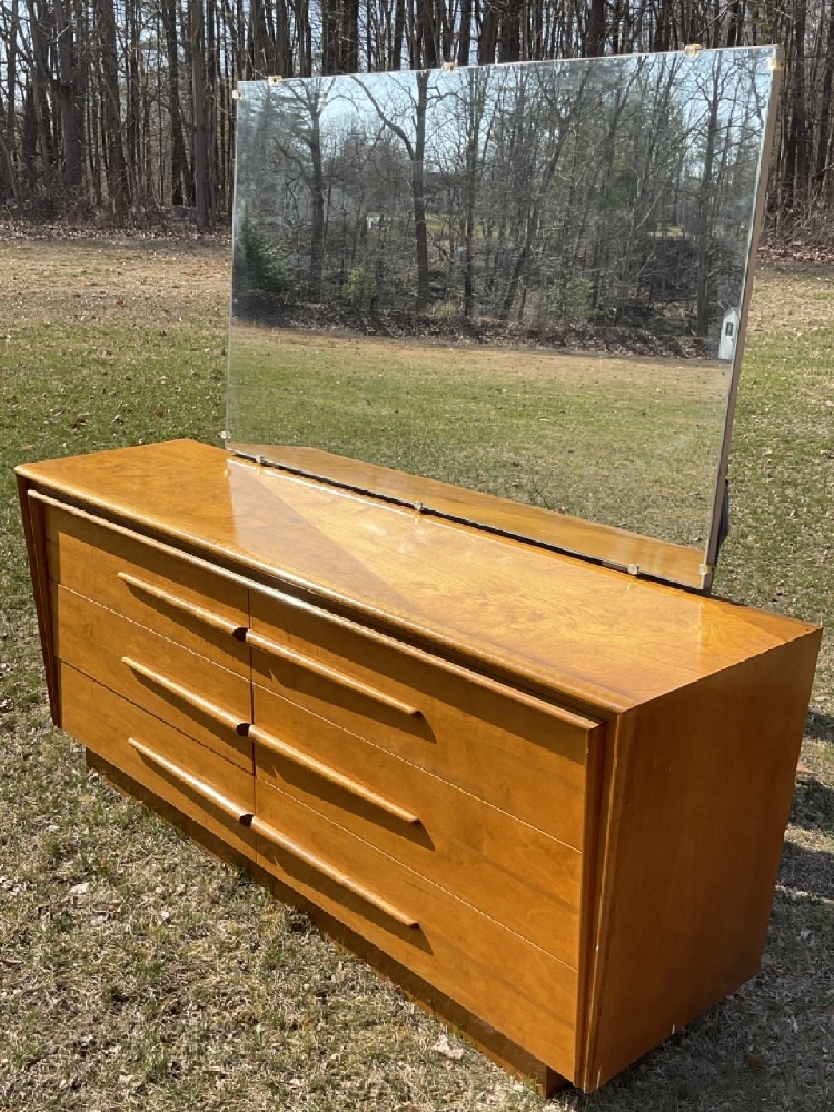 Edmund Spence MCM six (6) drawer dresser with separate mirror. Purchased from Modernage c.1950's. Some veneer chipping or loss noted. Please see photograph preview. Mirror original to dresser.