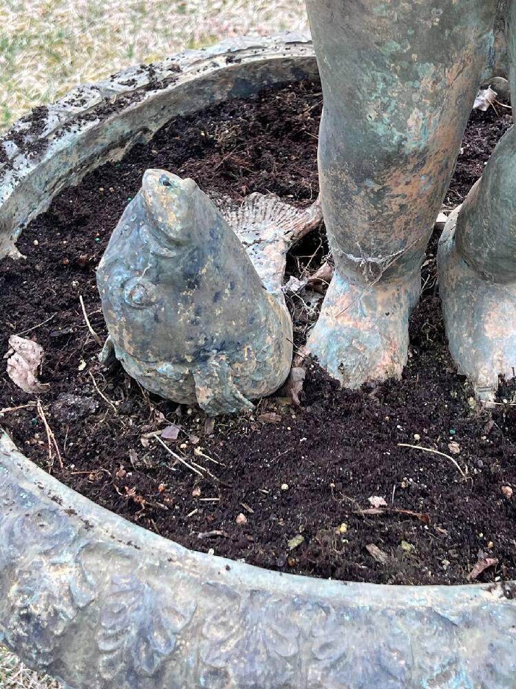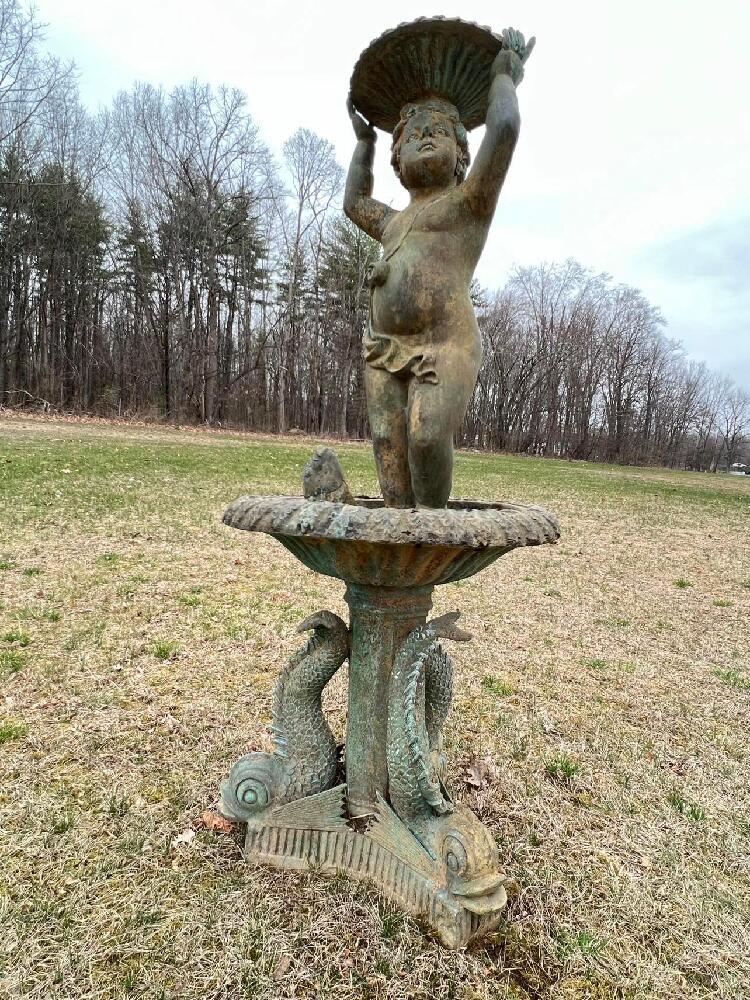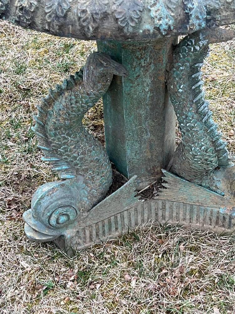A fantastic bronze fountain with dolphin fish base with large bowl having a full bodied fish showing out of bowl. The Putto or Cherub figure sets stand at center. Nice even patina.
