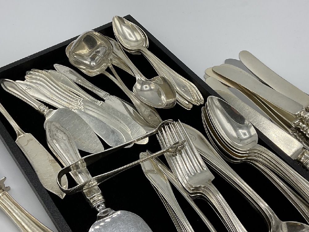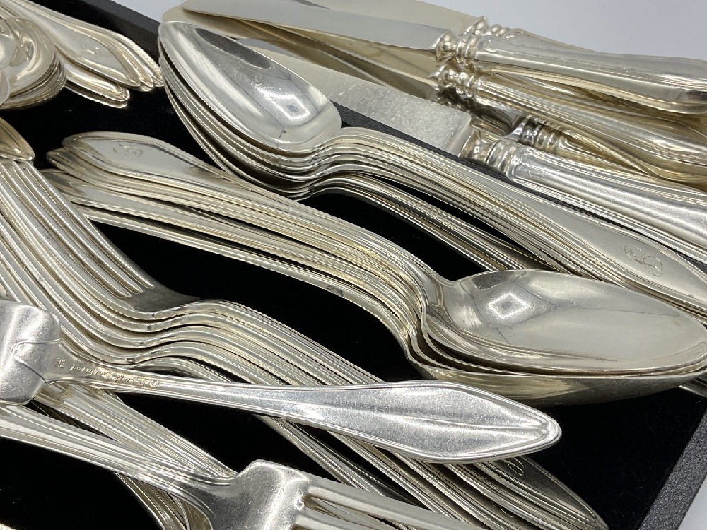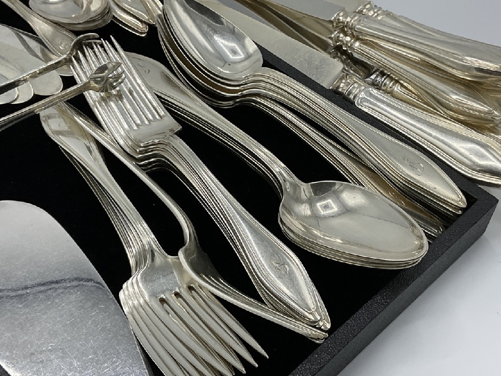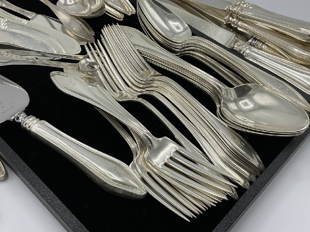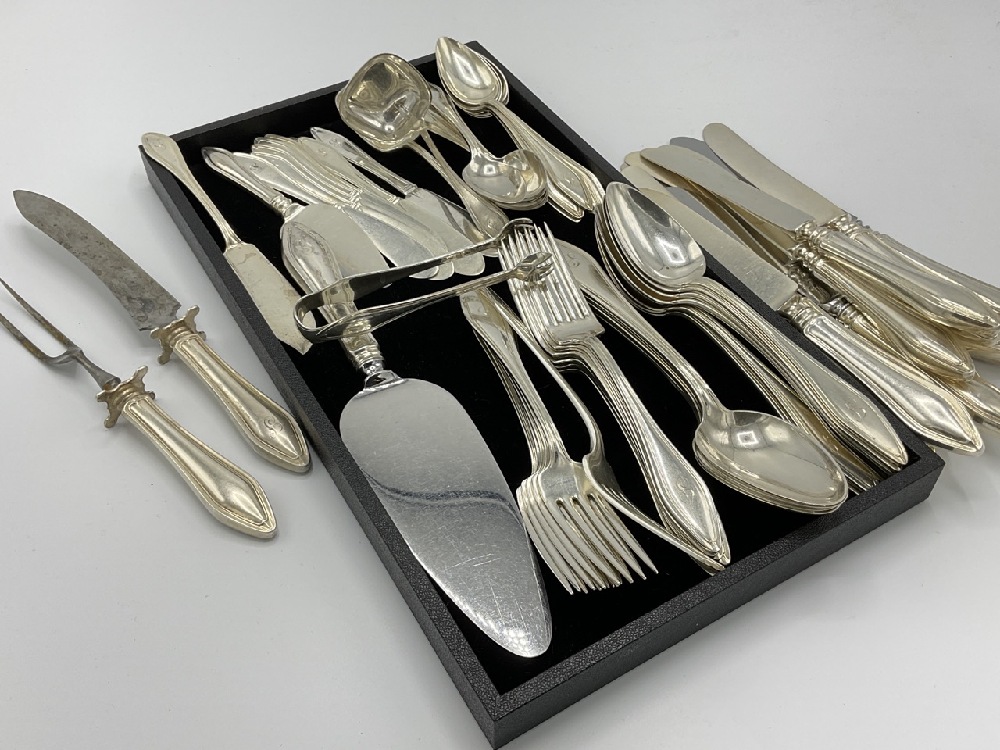 4 Large Spoons, 12 teaspoons, 2 ladles, 9 butter knives, 1 tongs, 2 servers. 51.4 toz.