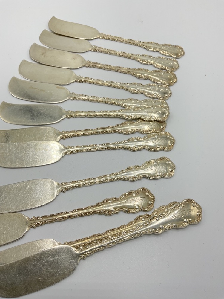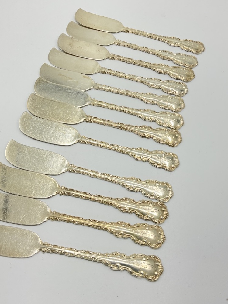 Set of 12 Whiting Sterling Silver Fancy Butter Knives.
