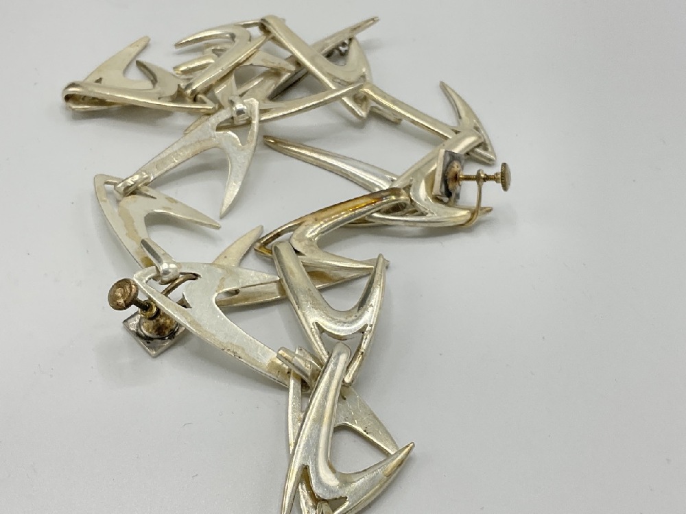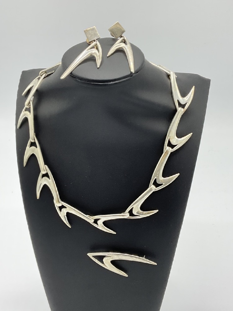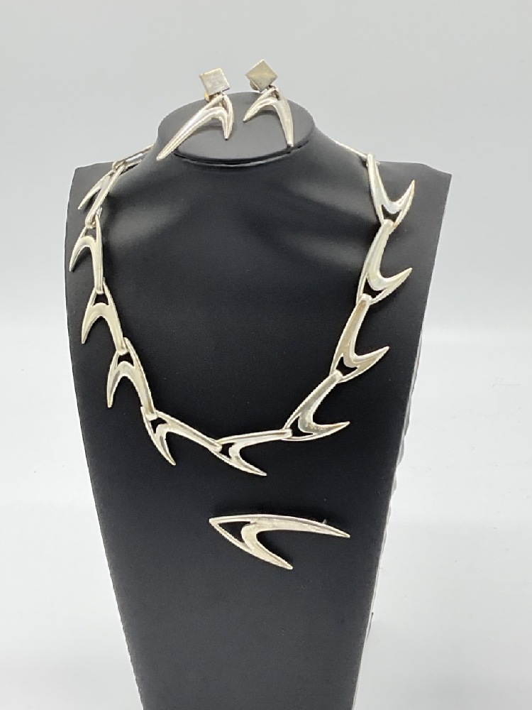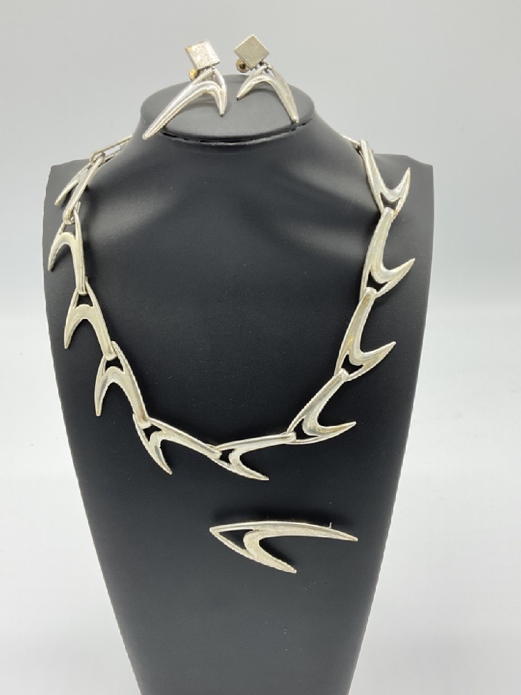 MCM Sterling silver Boomerang Necklace, Earrings and Broach. Artisan made, inscribed and dated 1959.