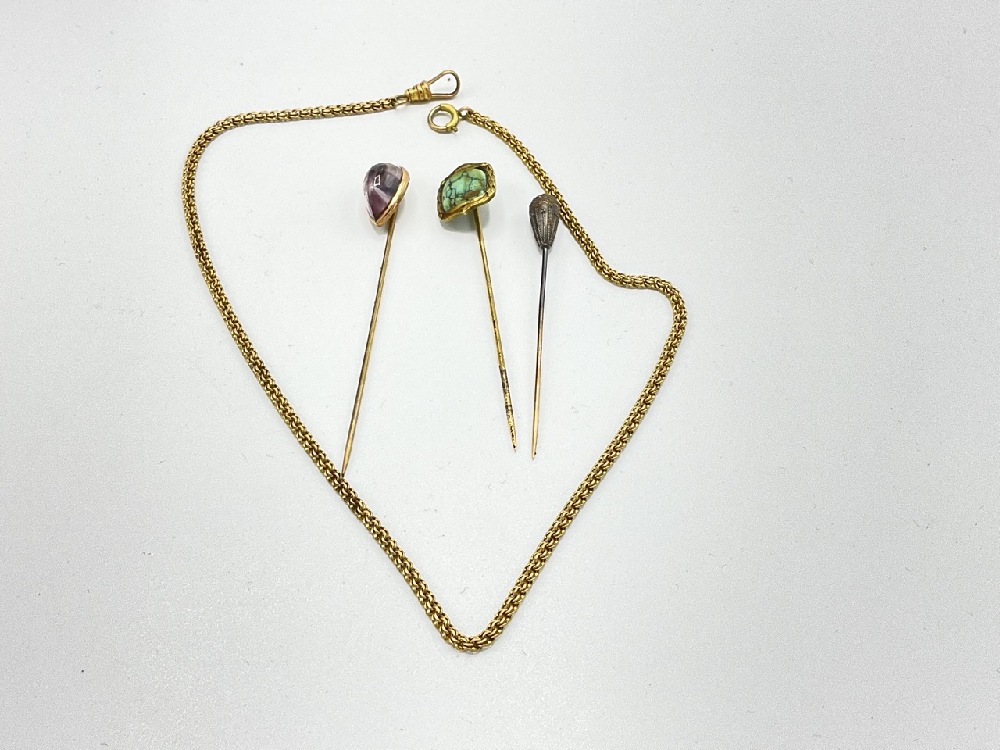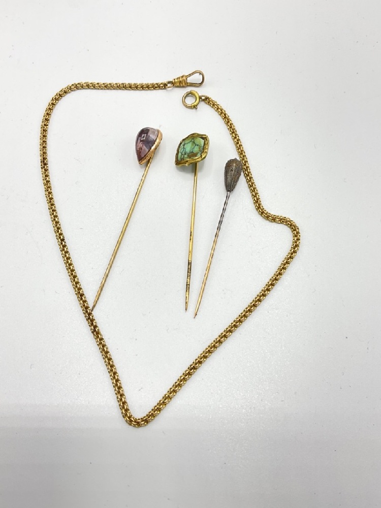 Estate compiled gold jewelry. Three (3) 14k gold stick pins (two with stones) and 10K yellow gold chain.