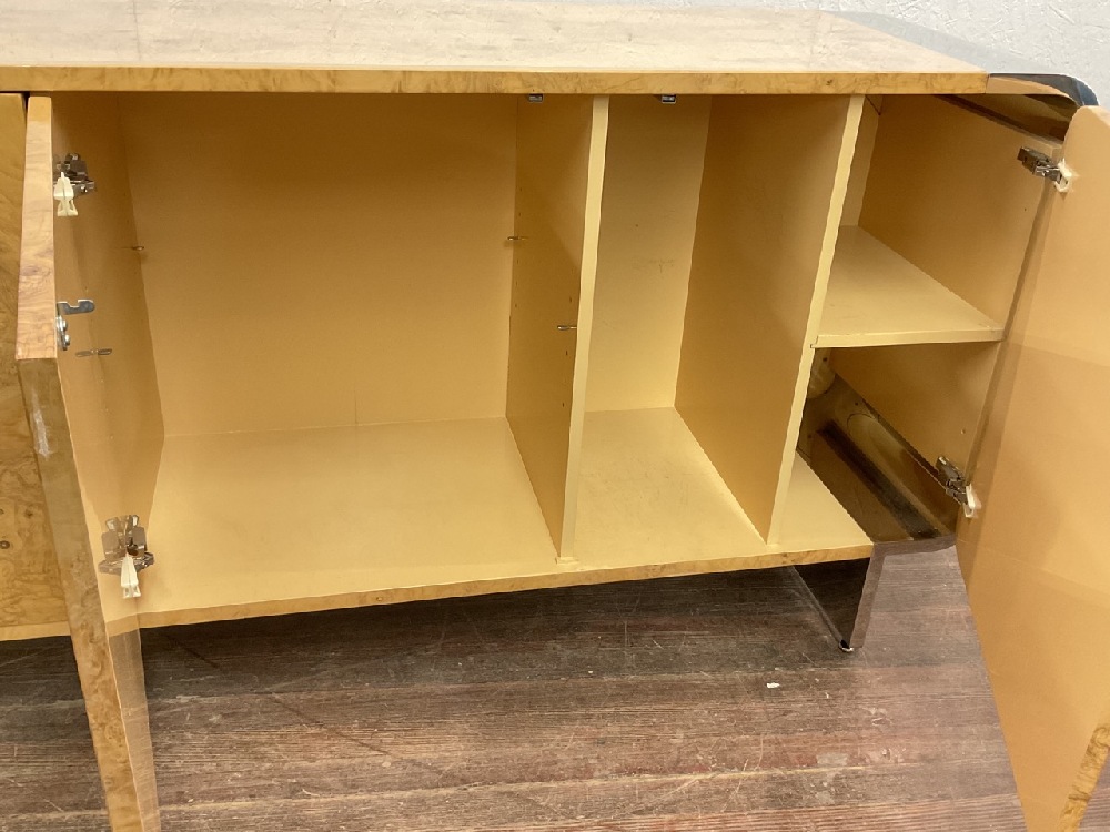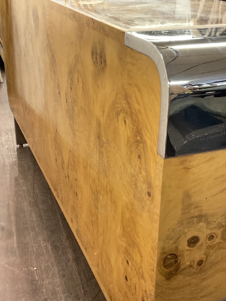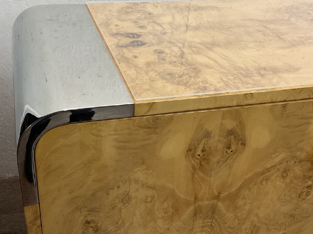 A fine birds eye maple veneered cabinet with chrome feet and accents. Original owners. c. 1970's. Pace Collection. Plexi glass fitted top for protection in place during photograph. Very fine condition. Some wear and scuffs from minimal use. Dimensions: 36”h x 74’ x 19”