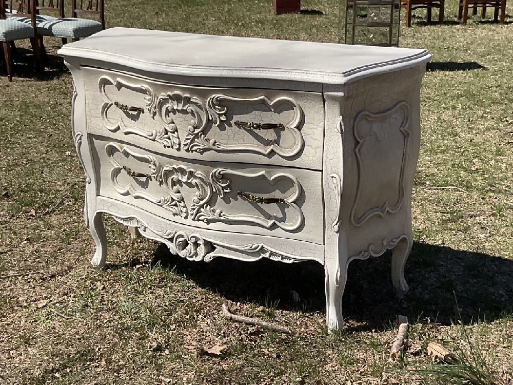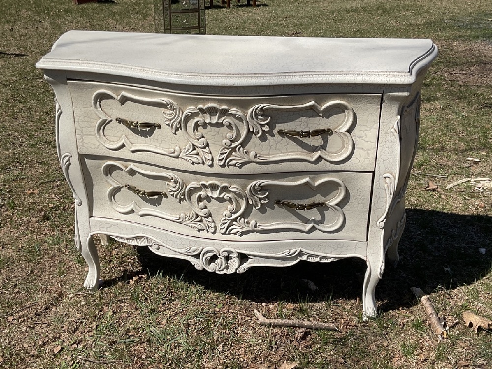 Bombay Style Two Drawer Dresser. White craquelure paint.