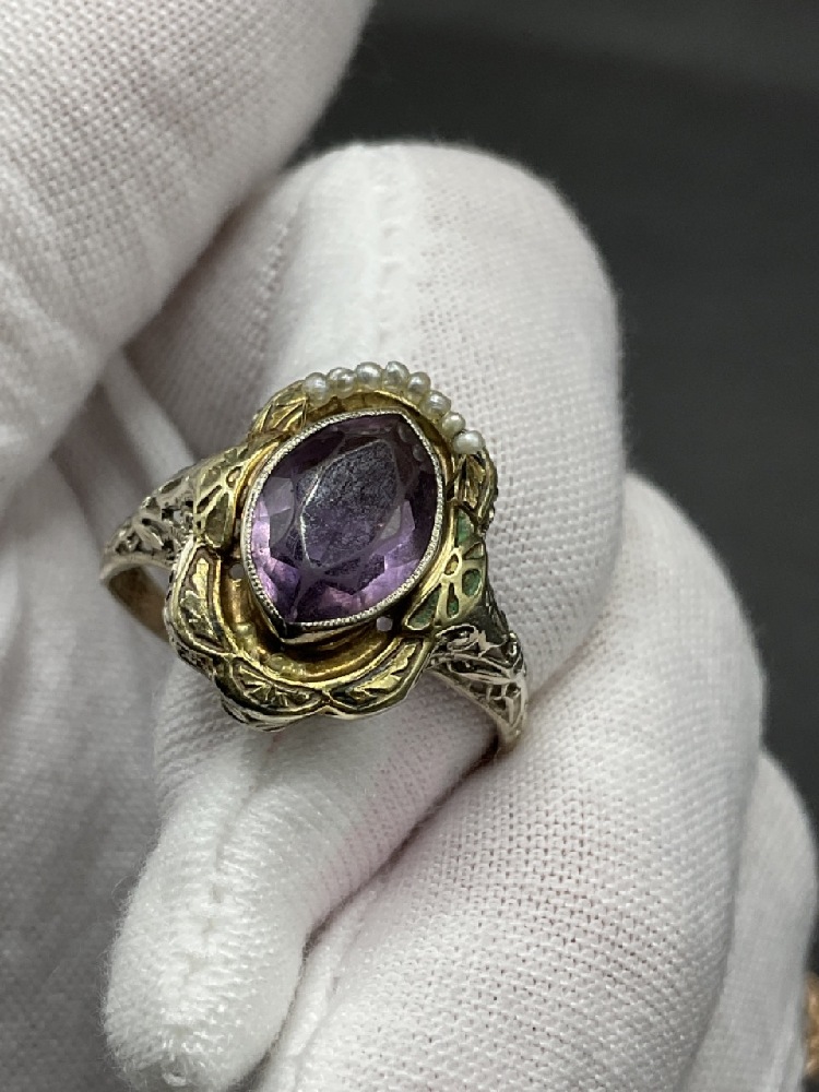 14k gold amethyst and seed pearl lady's ring.