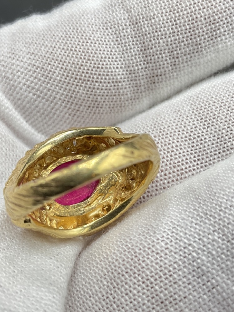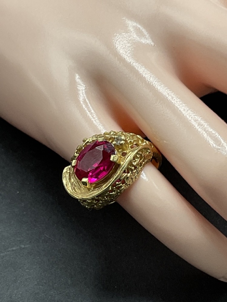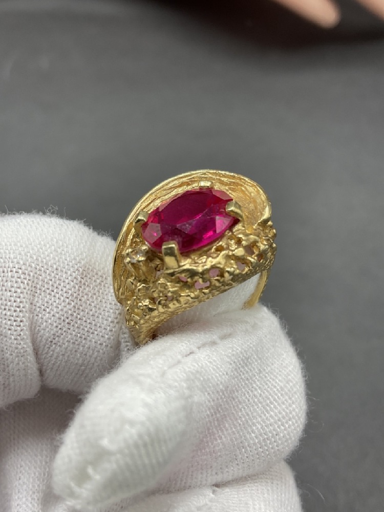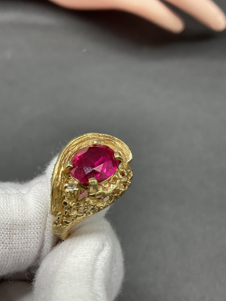 14K gold nugget ring with ruby and diamond stones.