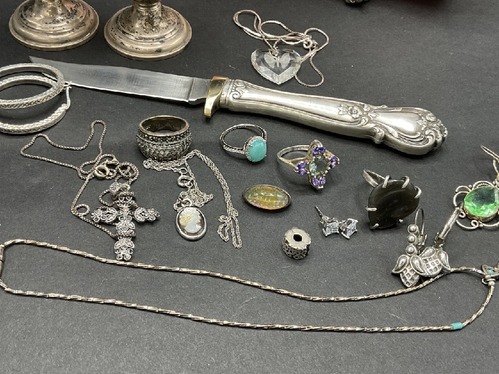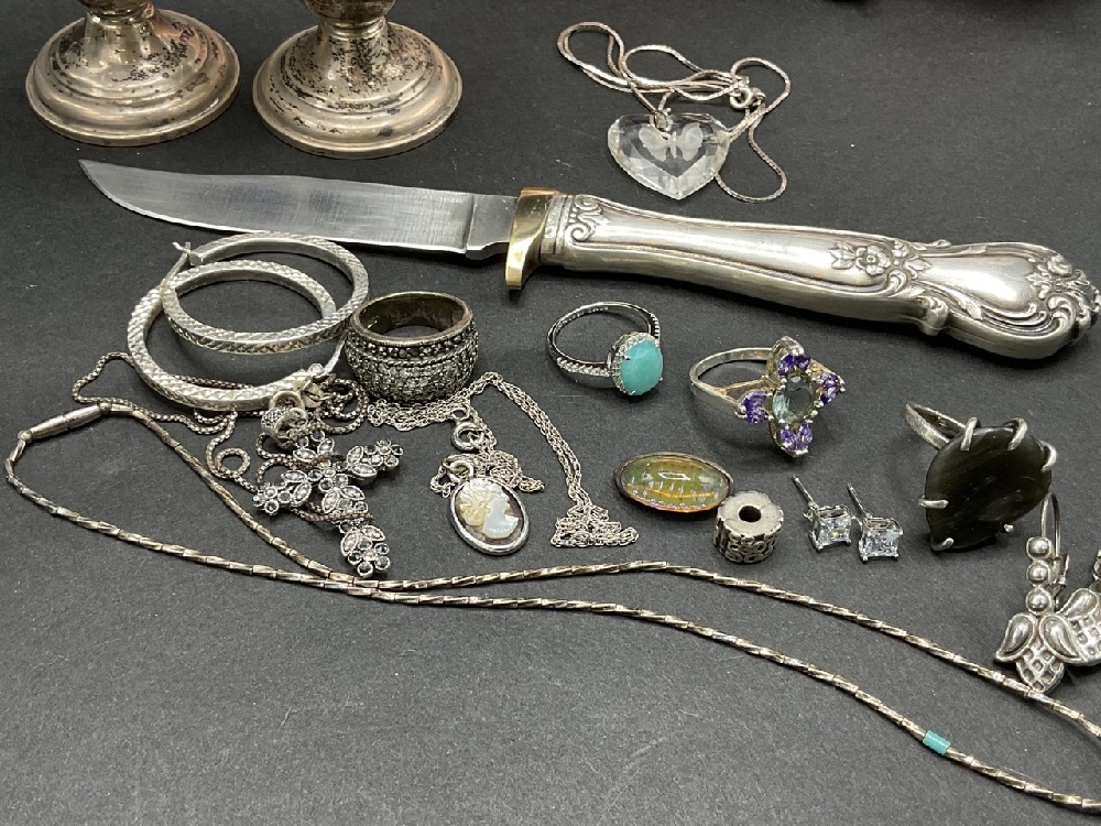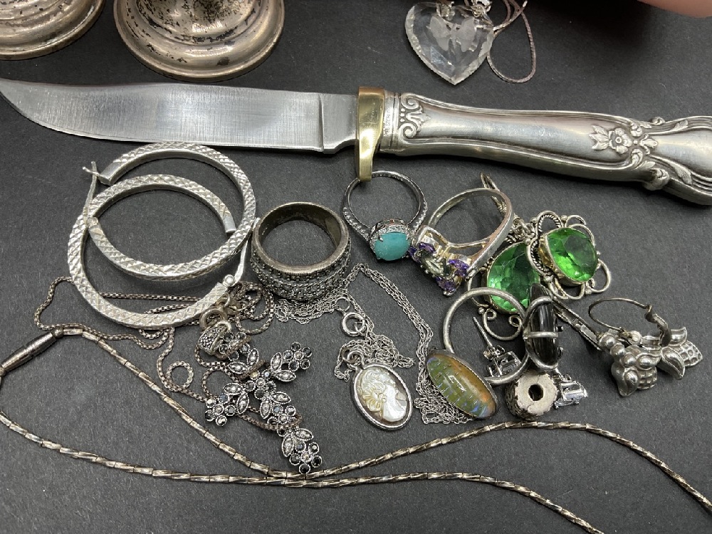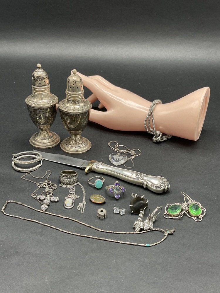 Estate compiled sterling silver fixed blade knife salt and pepper shakers and jewelry. As seen in photograph preview.