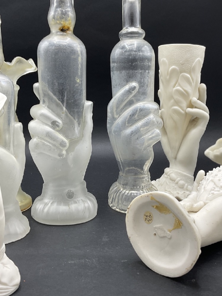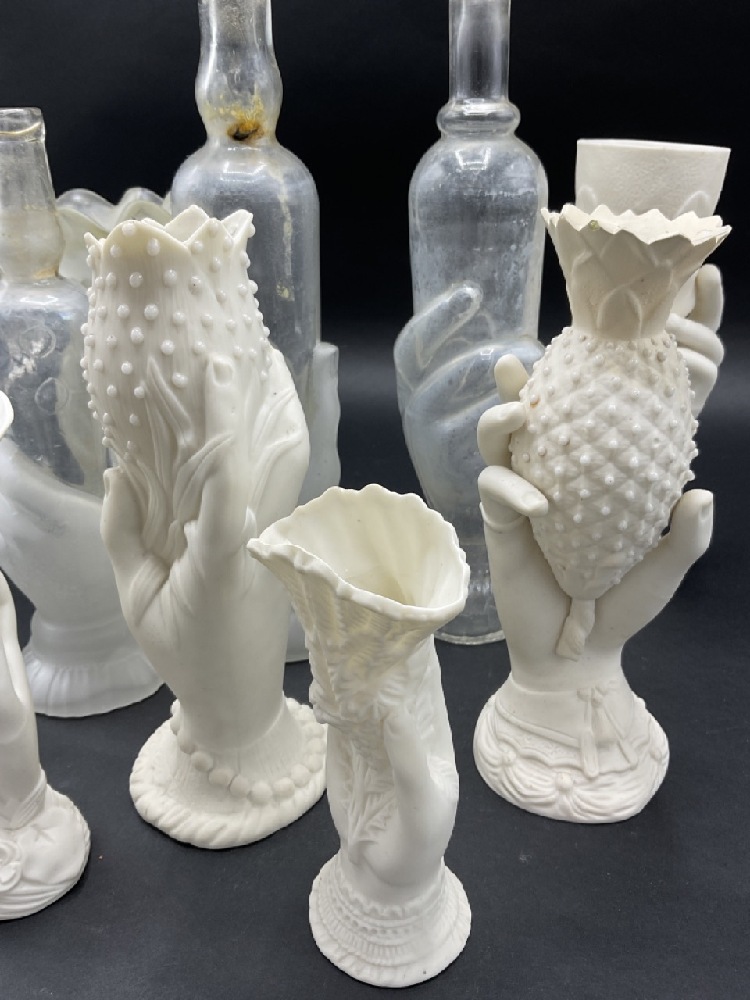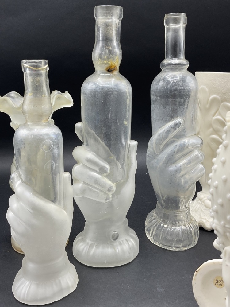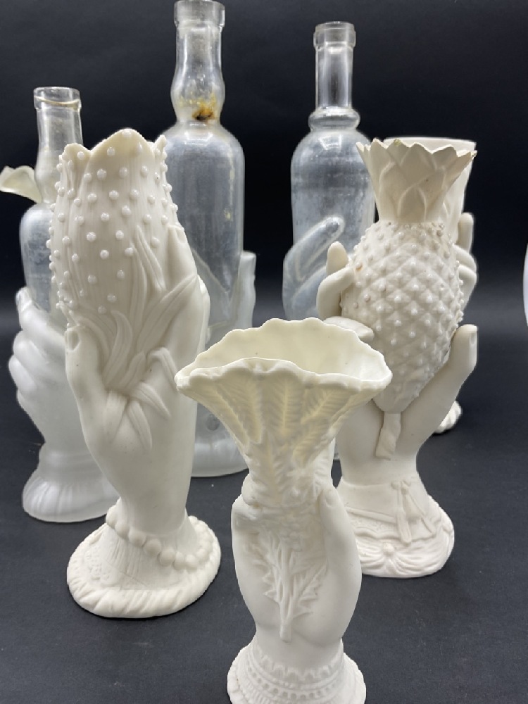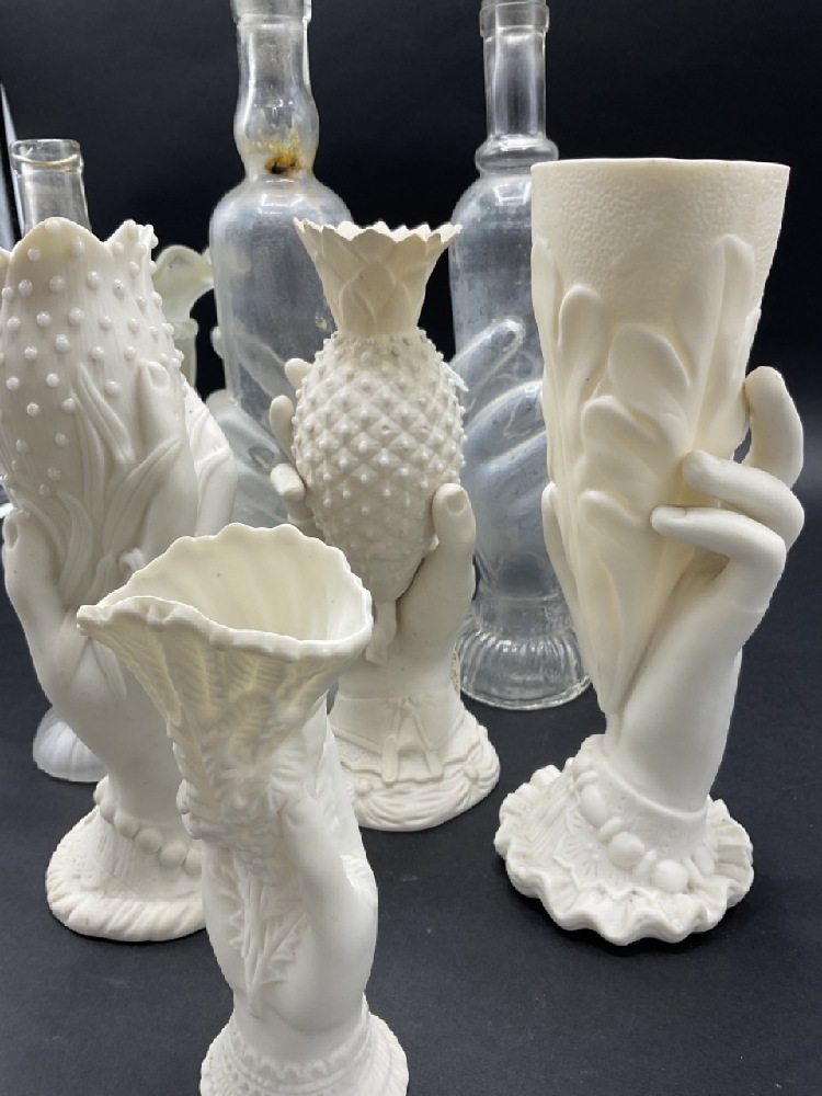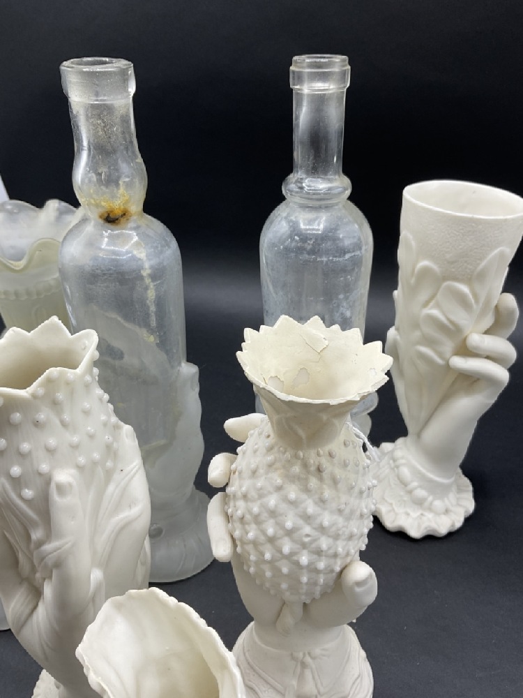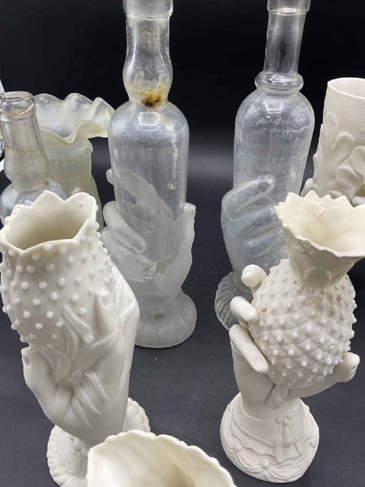 Collection of Parian Ware and Glass Hand Vases and French glass bottles.