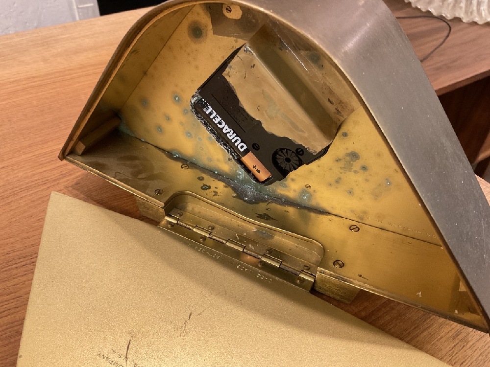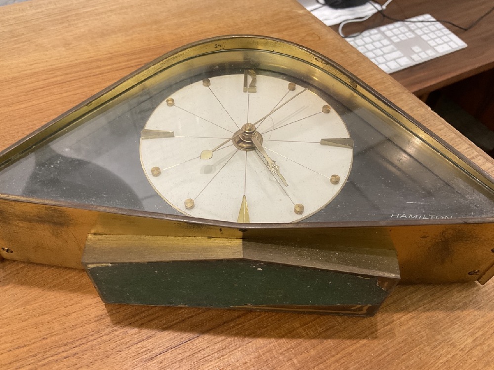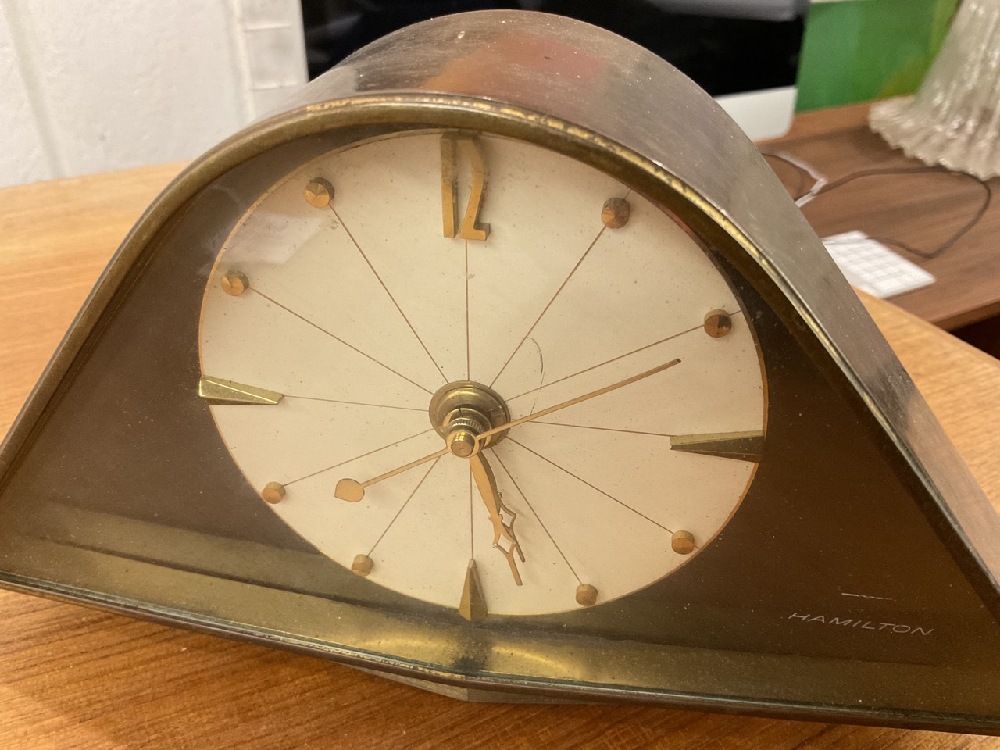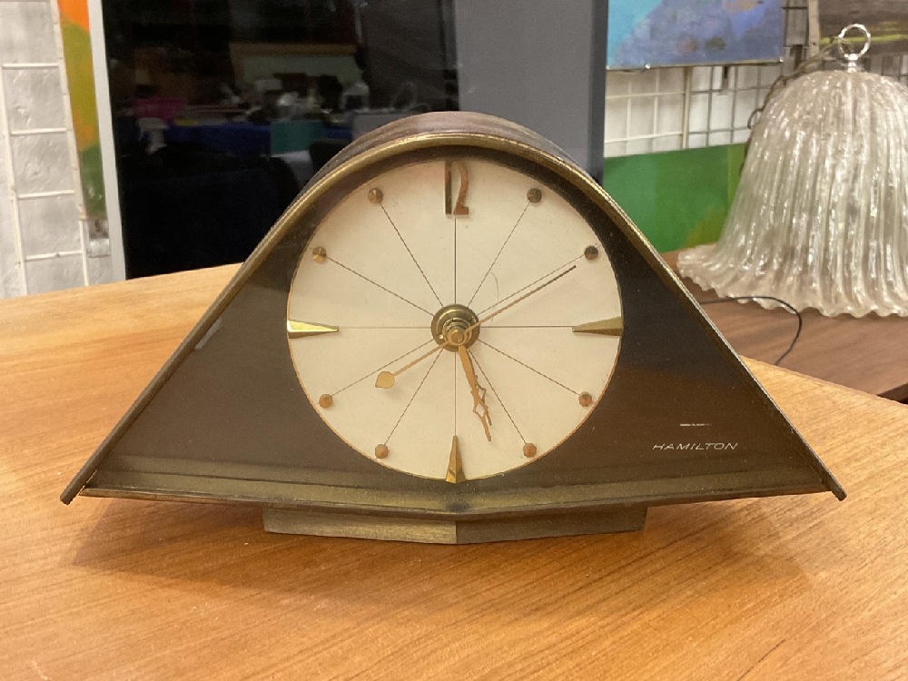 MCM Hamilton brass battery operated desk clock. Cleaning needed. Please see photograph preview.