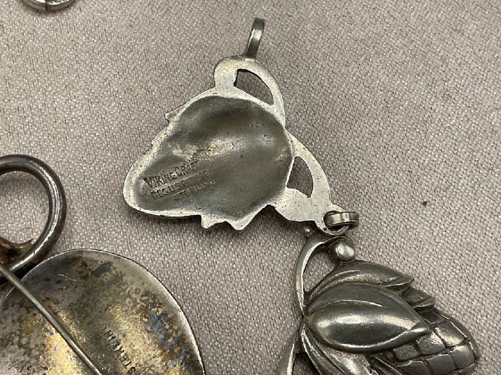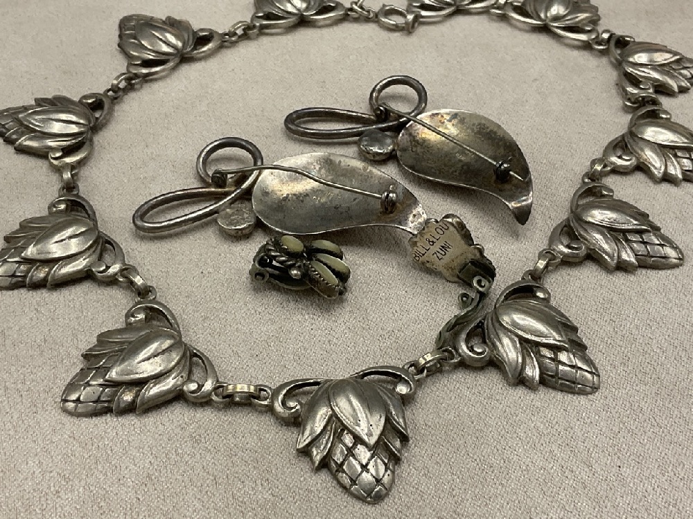 American vintage sterling silver jewelry lot. Viking Craft necklace, Zuni Earrings with opals and XTO pair of pins.