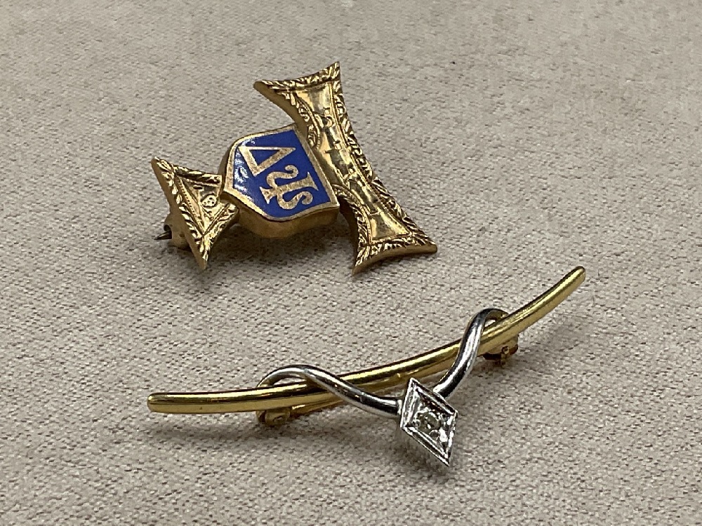 Two (2) 14k yellow gold pins. One insignia pin and diamond pin.