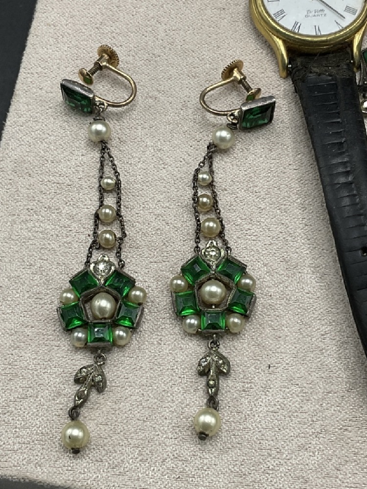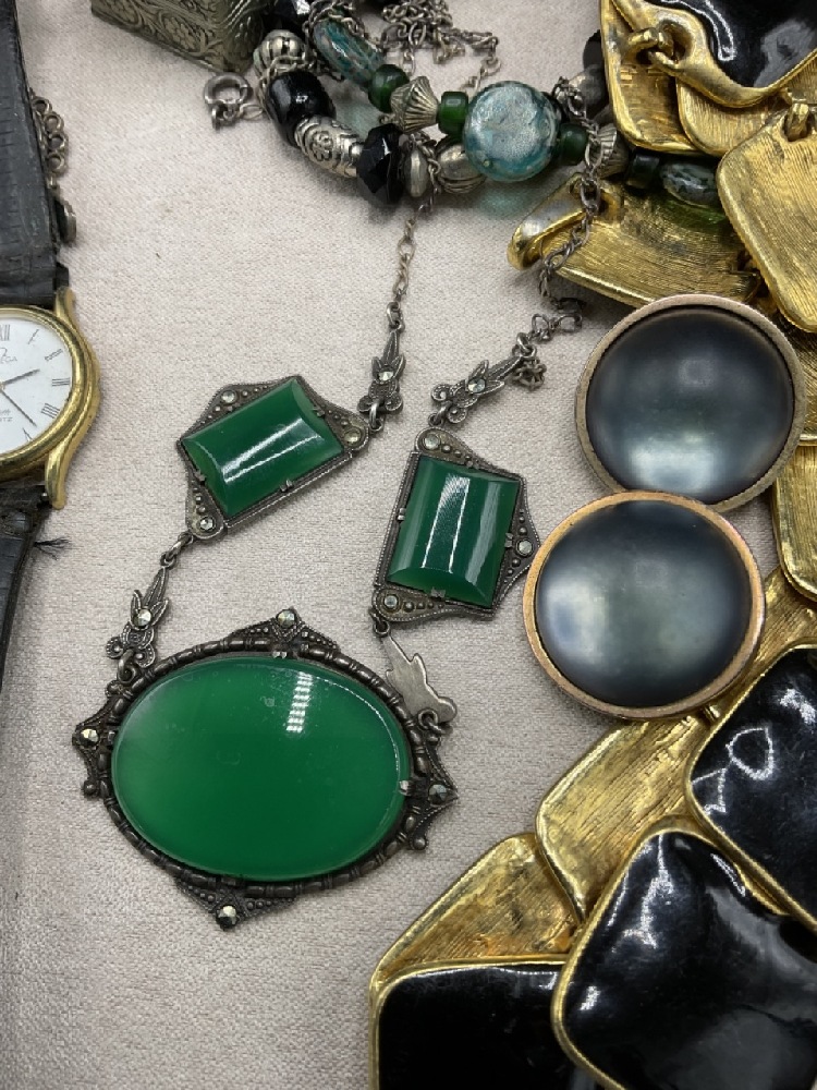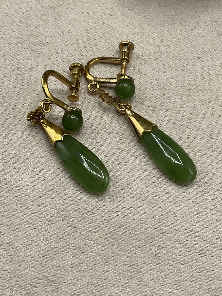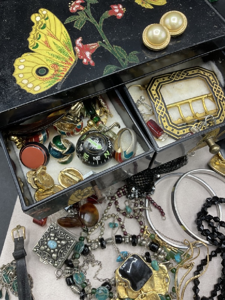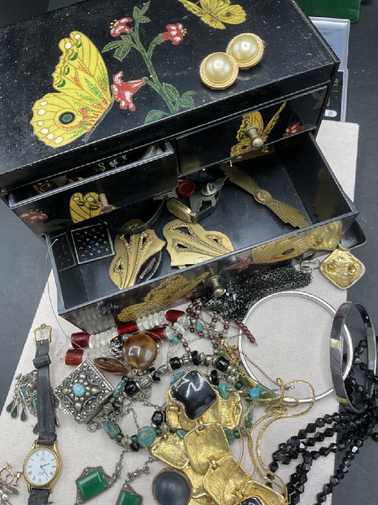 Estate compiled jewelry. Sterling silver earrings, Christian Dior earrings, Gold filled jade earrings, necklaces, bracelets, clips and more. Laquerware jewelry box included.