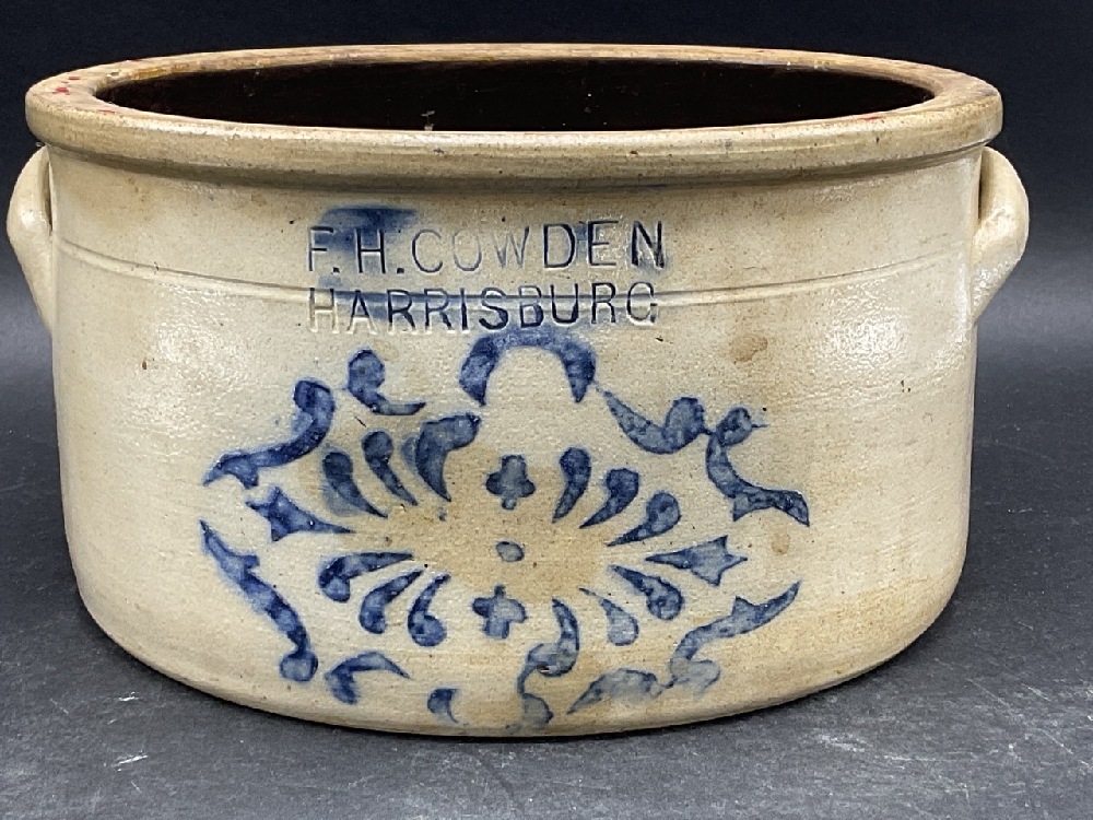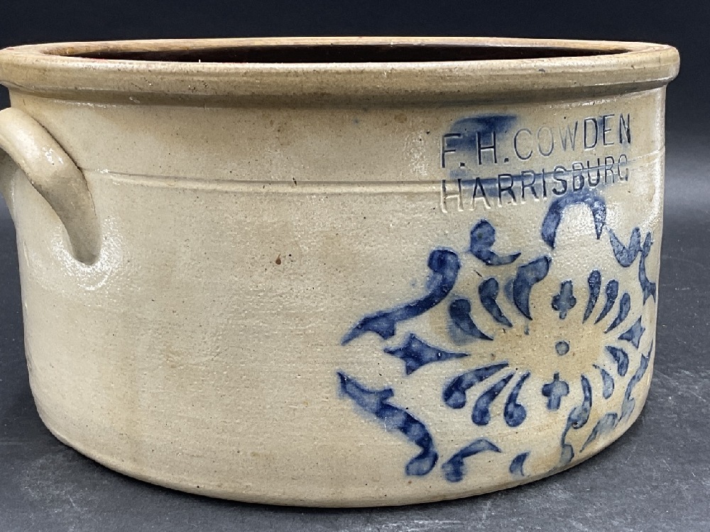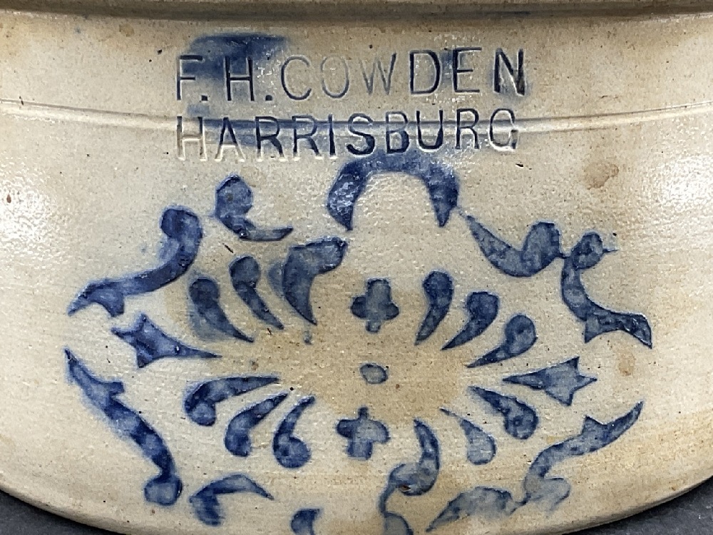 F.H. Cowden Harrisburg, PA blue decorated crock. Note Shallow 1/2 Size.