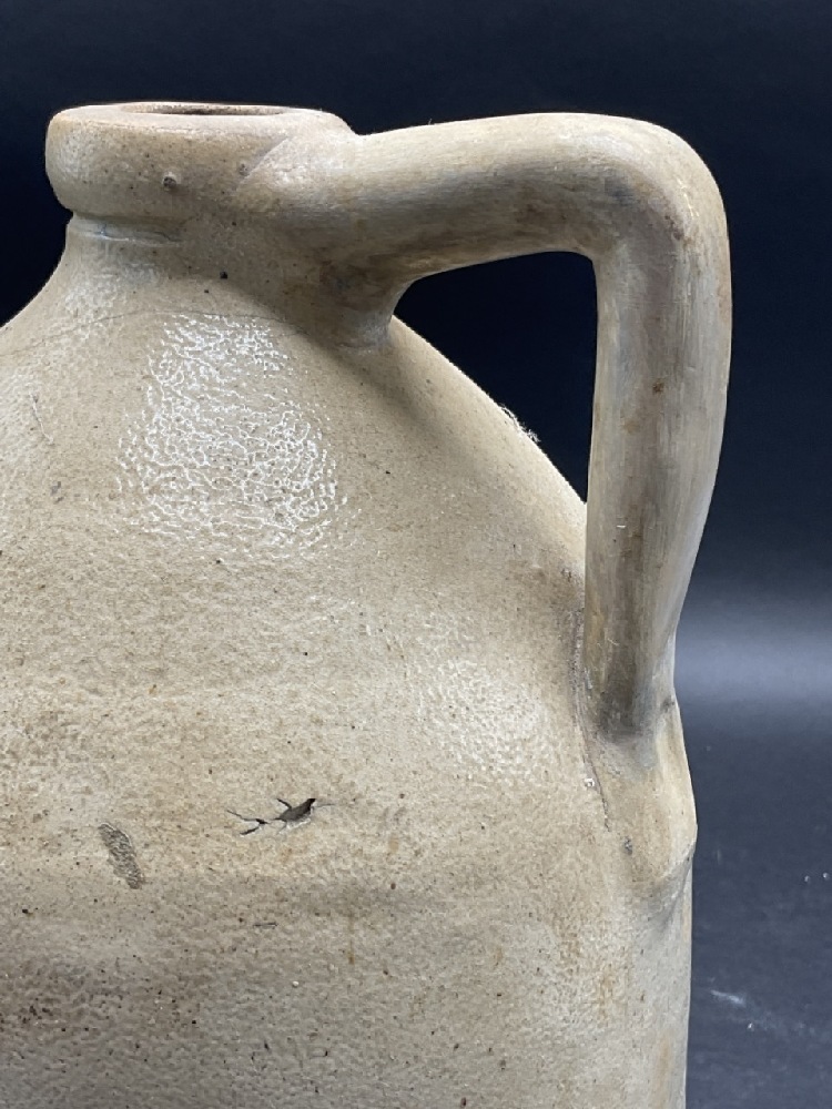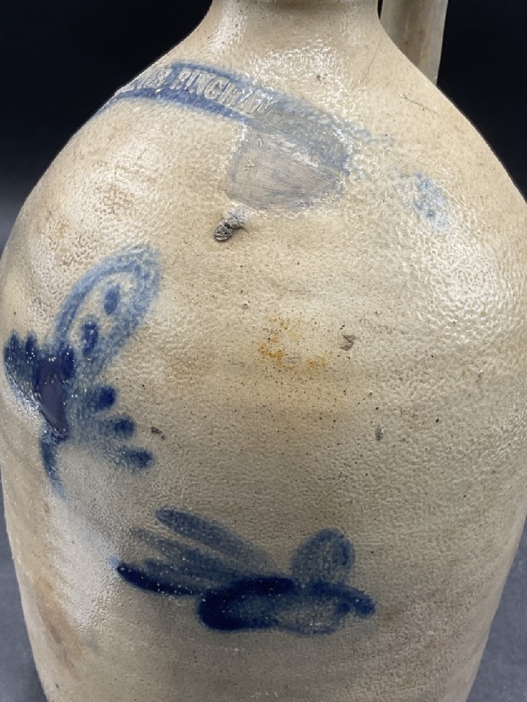 White's Binghampton, NY Stoneware Jug with cobalt blue decoration. Butterfly and Bee. Restoration seen in handle and in body. Please see photograph preview.