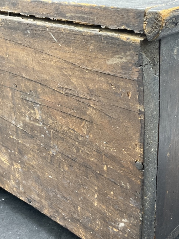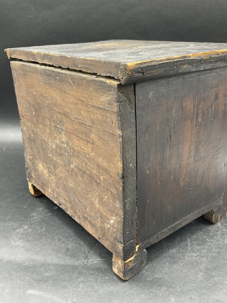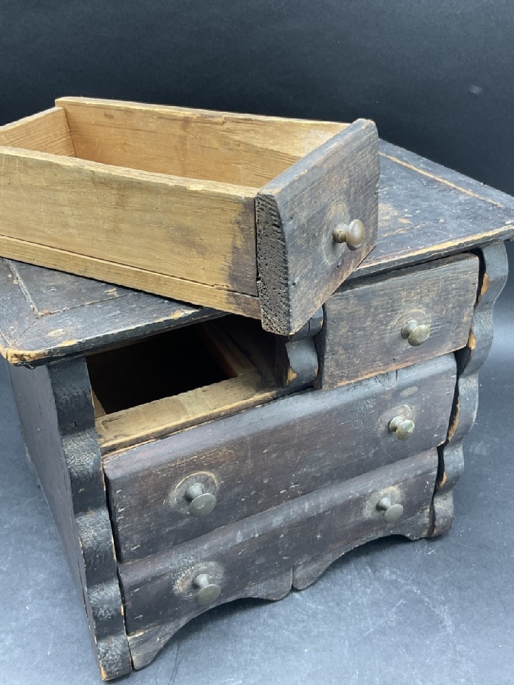Pine two over two dresser with brass pulls. 19th century primitive child's doll size.