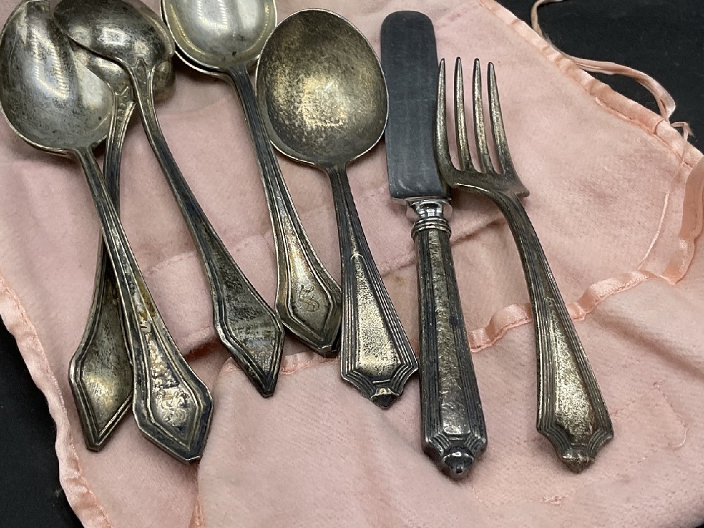 Compiled estate sterling silver spoons. Six dessert spoons and child's set.