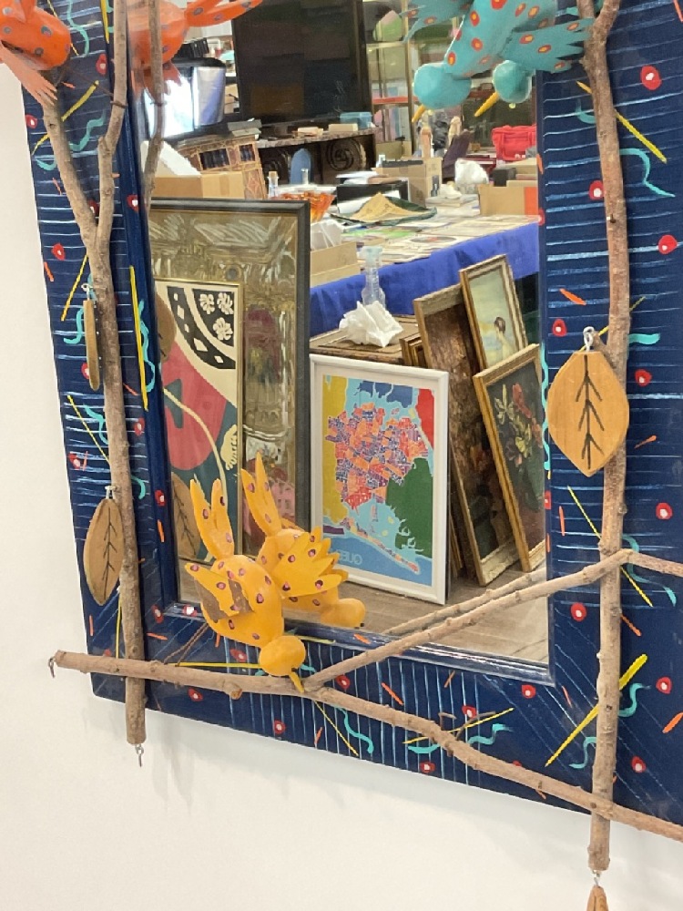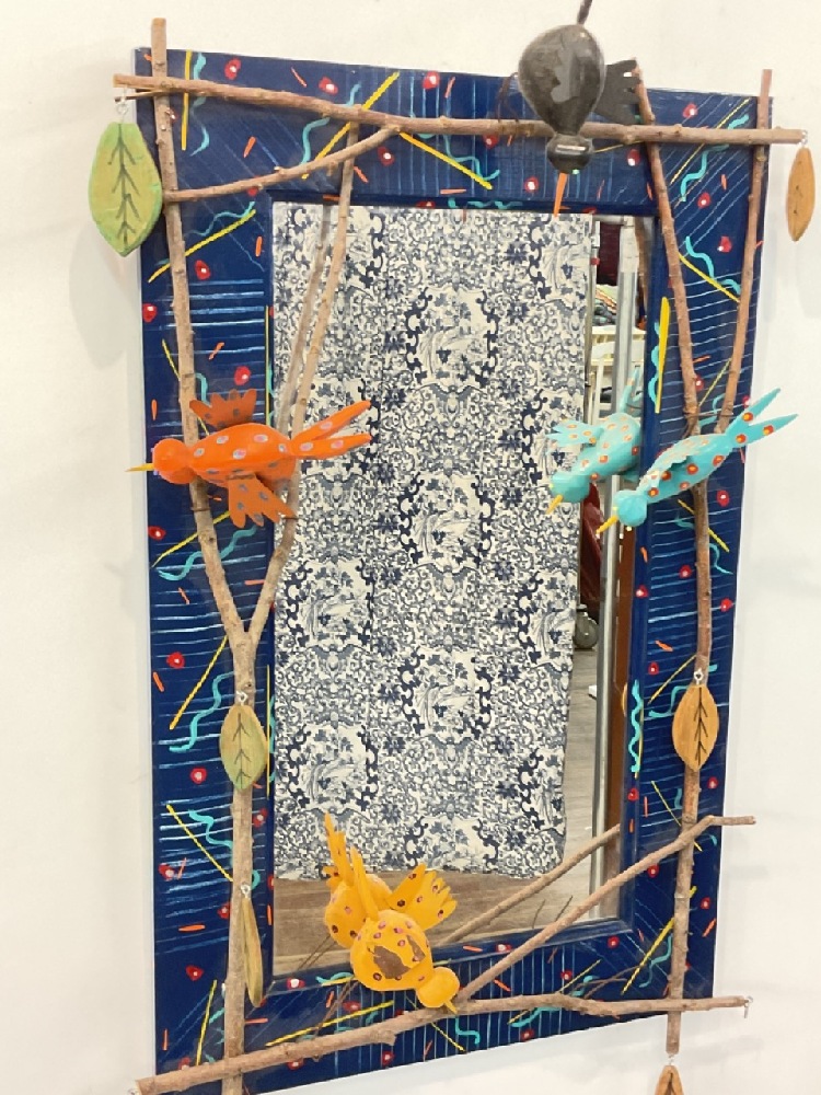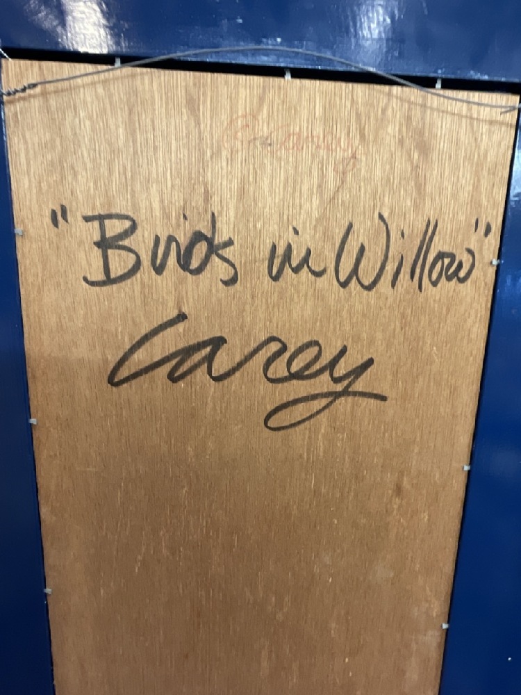 Craig Carey Artist signed whimsical "Birds in the Willows" decorated folk art mirror. c.1990's.