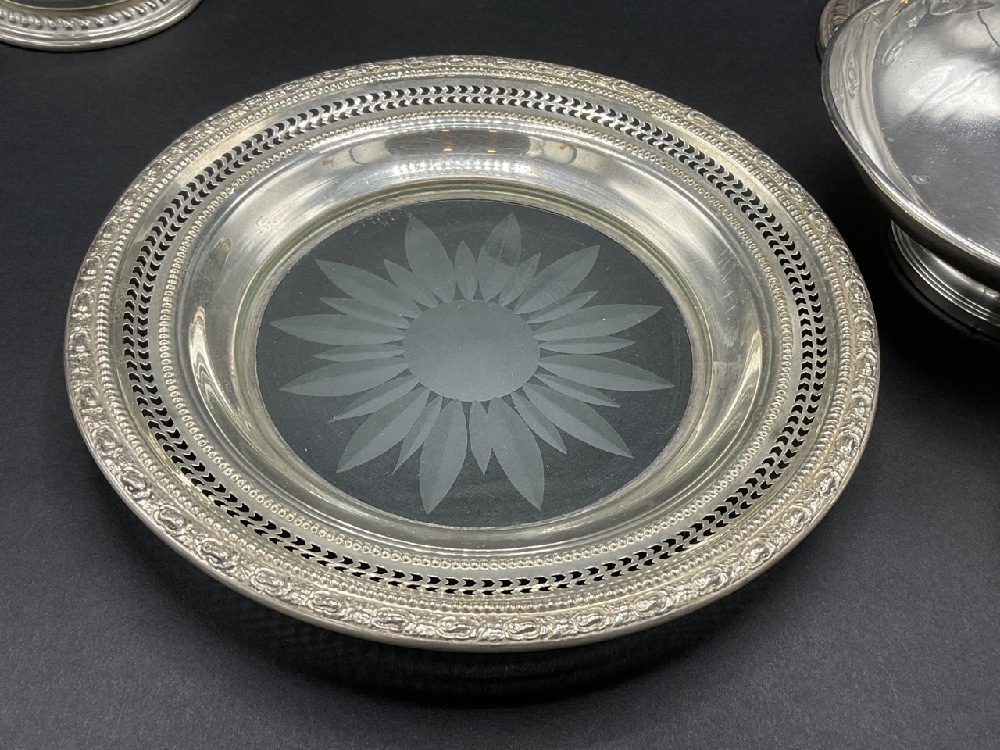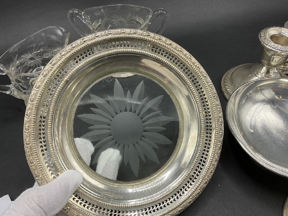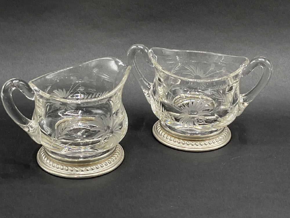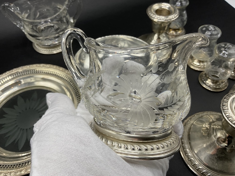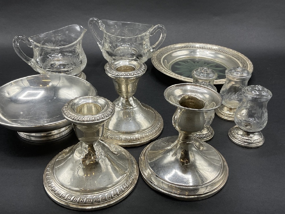 Compiled sterling silver table wares. A fine cut glass sugar and creamer with applied handles, tray, glass salt and pepper shakers, weighted wares etc. As seen in photograph preview.