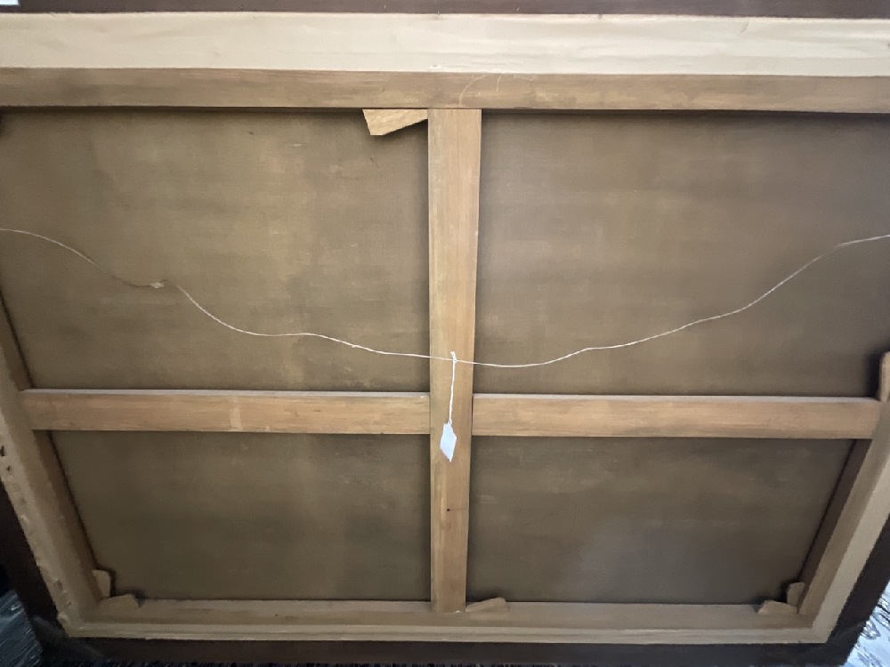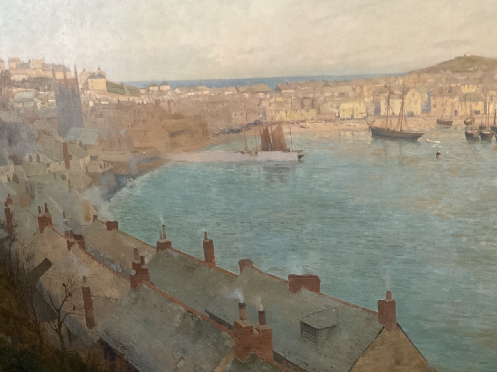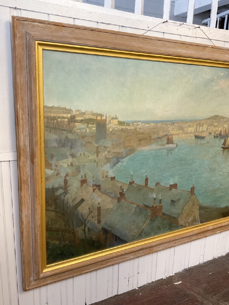 Edmund G. Fuller (English, 1858-1940) Titled: St. Ives Harbour Oil on canvas.Dimensions: 47” x 71” and 57” x 81” A fine harbour scene of monumental size housed in a custom frame. Provenance: Richard Green Gallery (label verso)