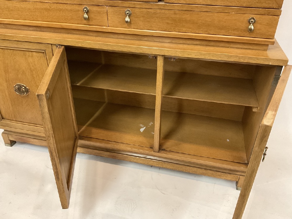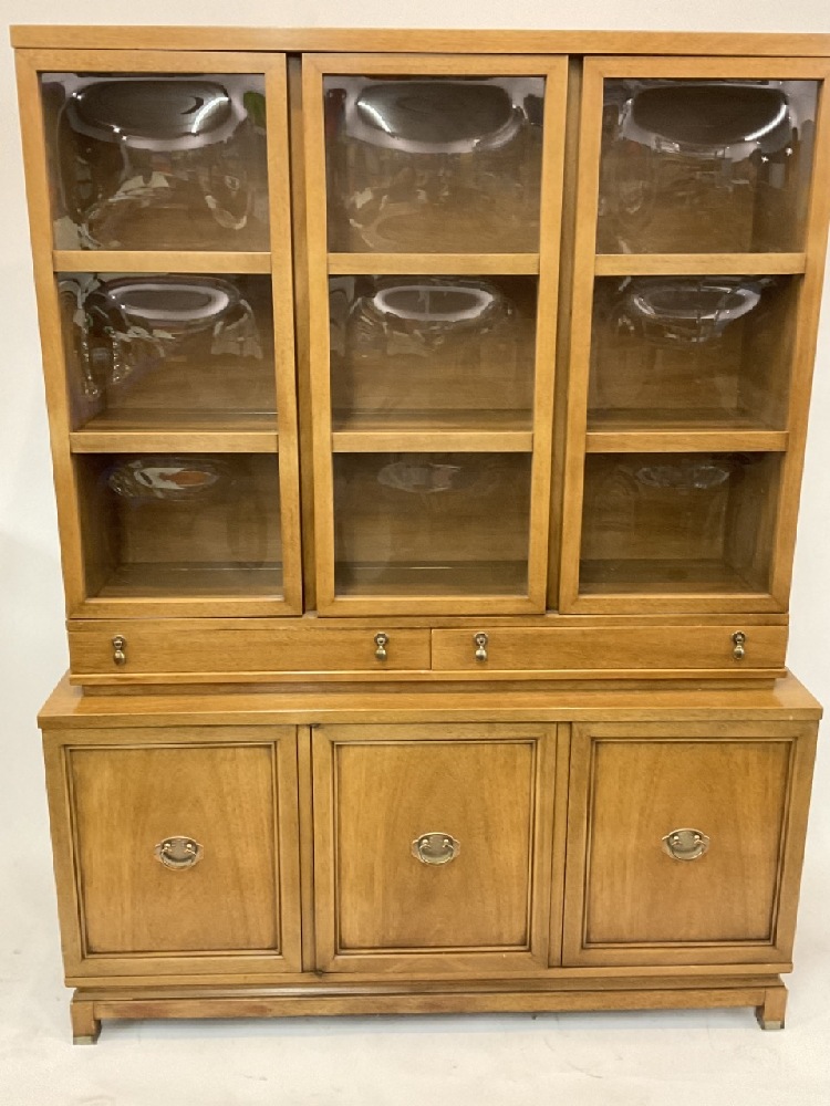 Quality MCM American of Martinsville breakfront china cabinet with bubble glass panes. Dimensions: 73 1/2" X 54" X 15 1/2" depth