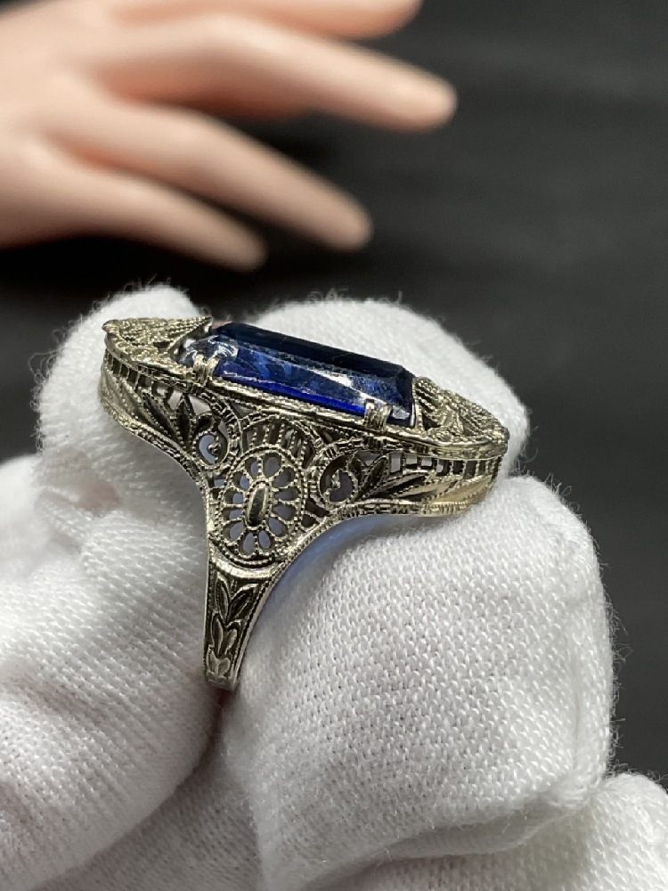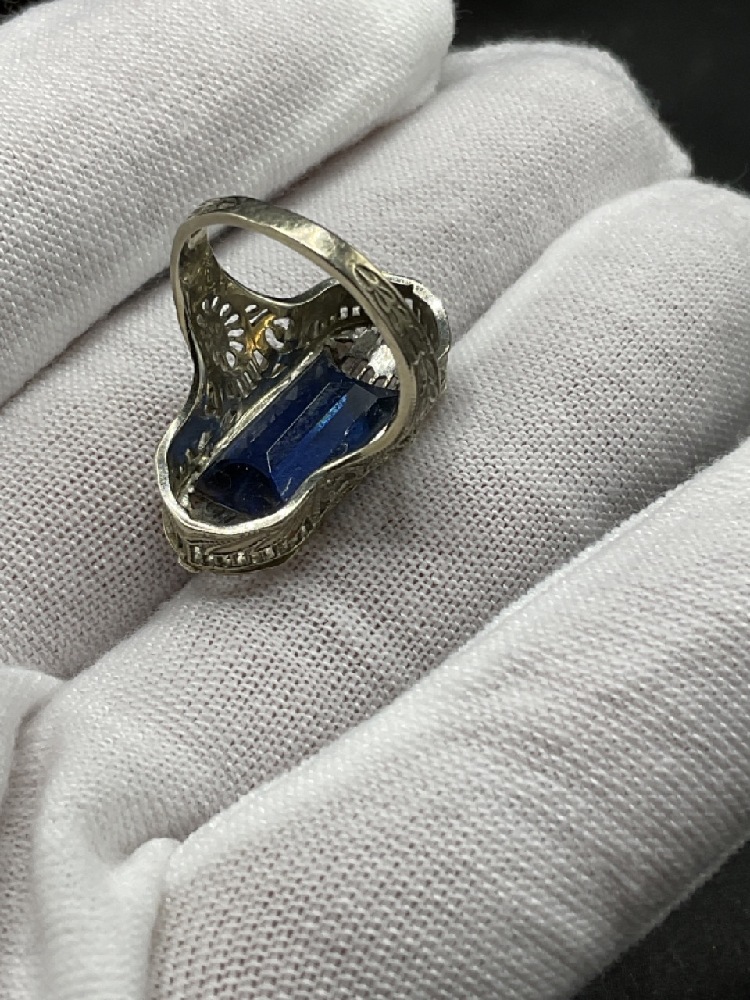 14K White Gold and Blue Sapphire Glass Stone Ring.