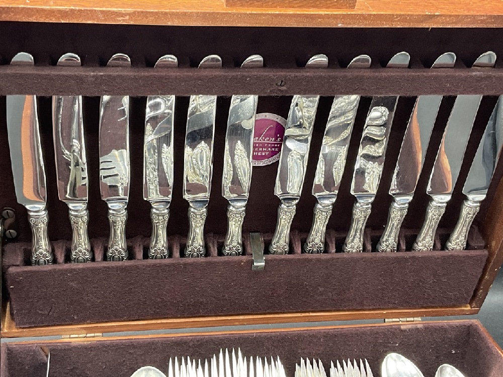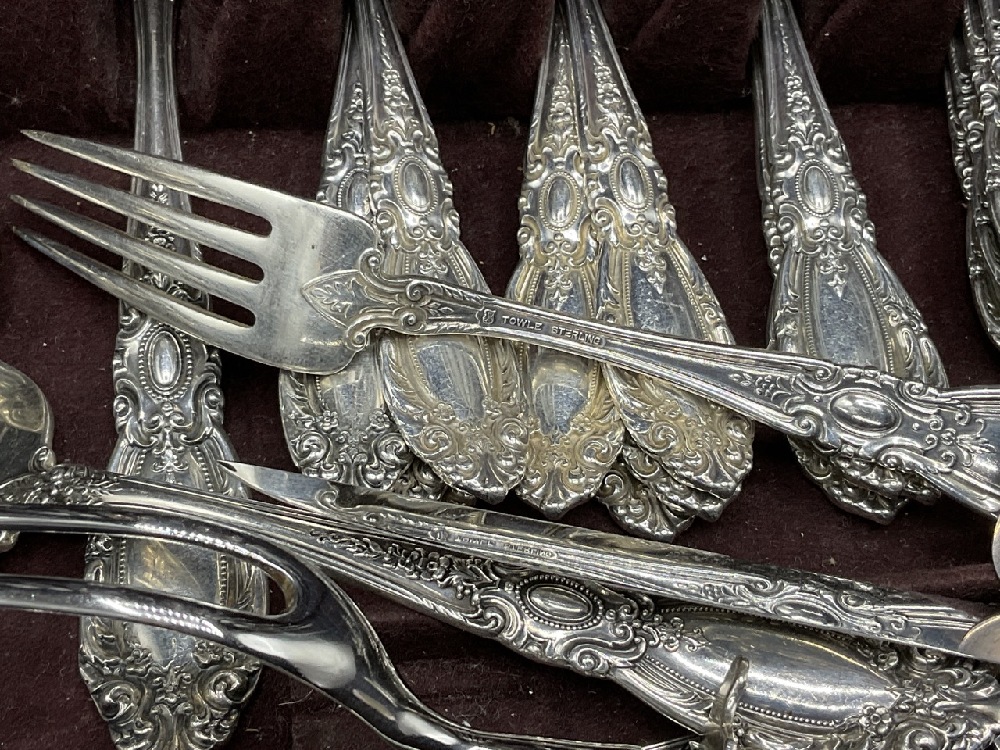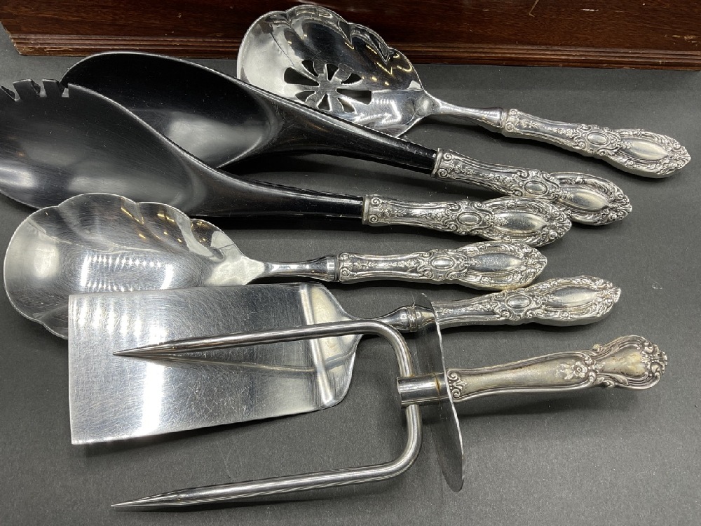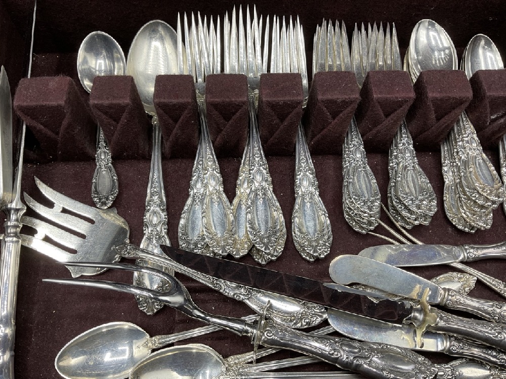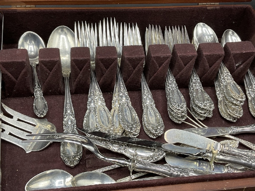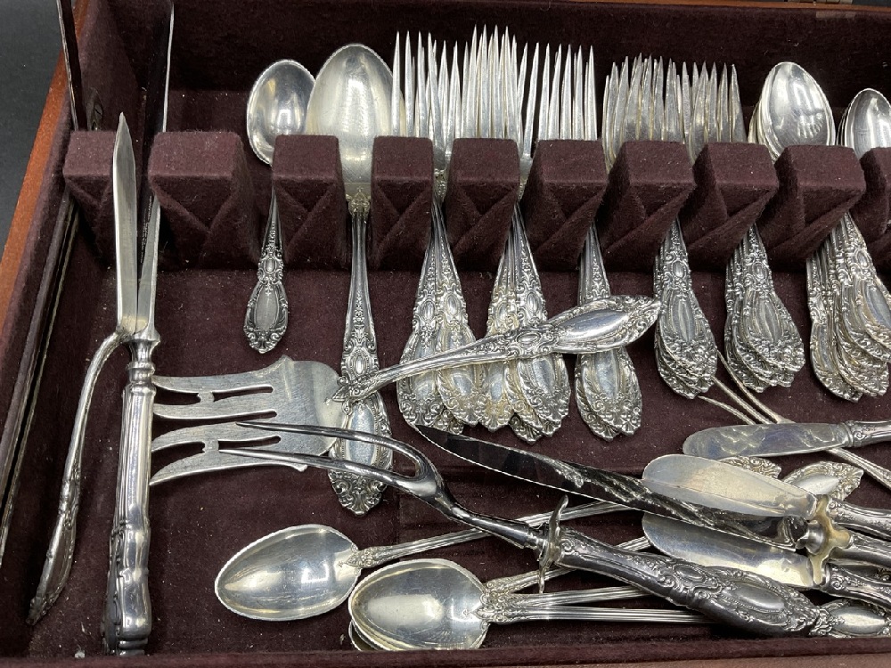 Total weight: 76.386 troy ounces plus 71.269troy ounces dinner knives and sterling handled serving pieces. All included is 147.65 troy ounces