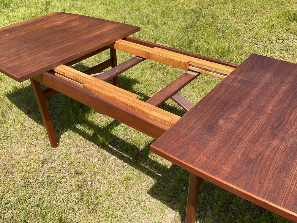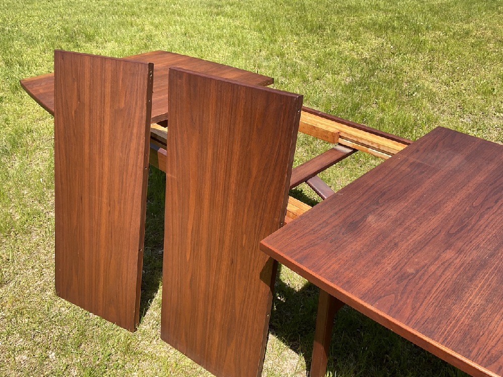 Jens Risom Teakwood Dining Room Table with Ten (10) Chairs, Eight (8) Side and Two (2) Arm. Original owner. Chairs still have labels present. Chair upholstery is dry rotted from age and needs to be replaced. Table pads included.