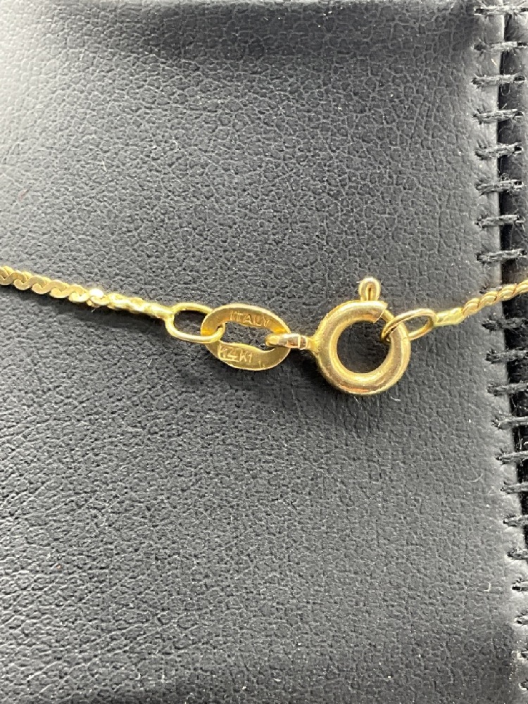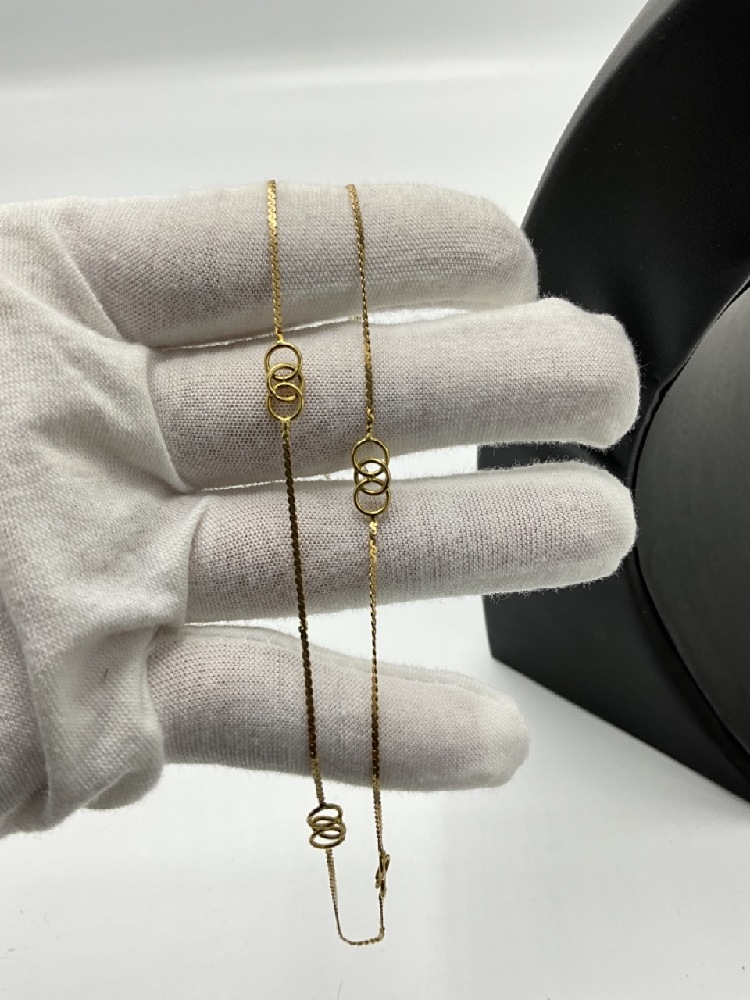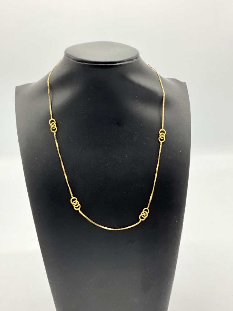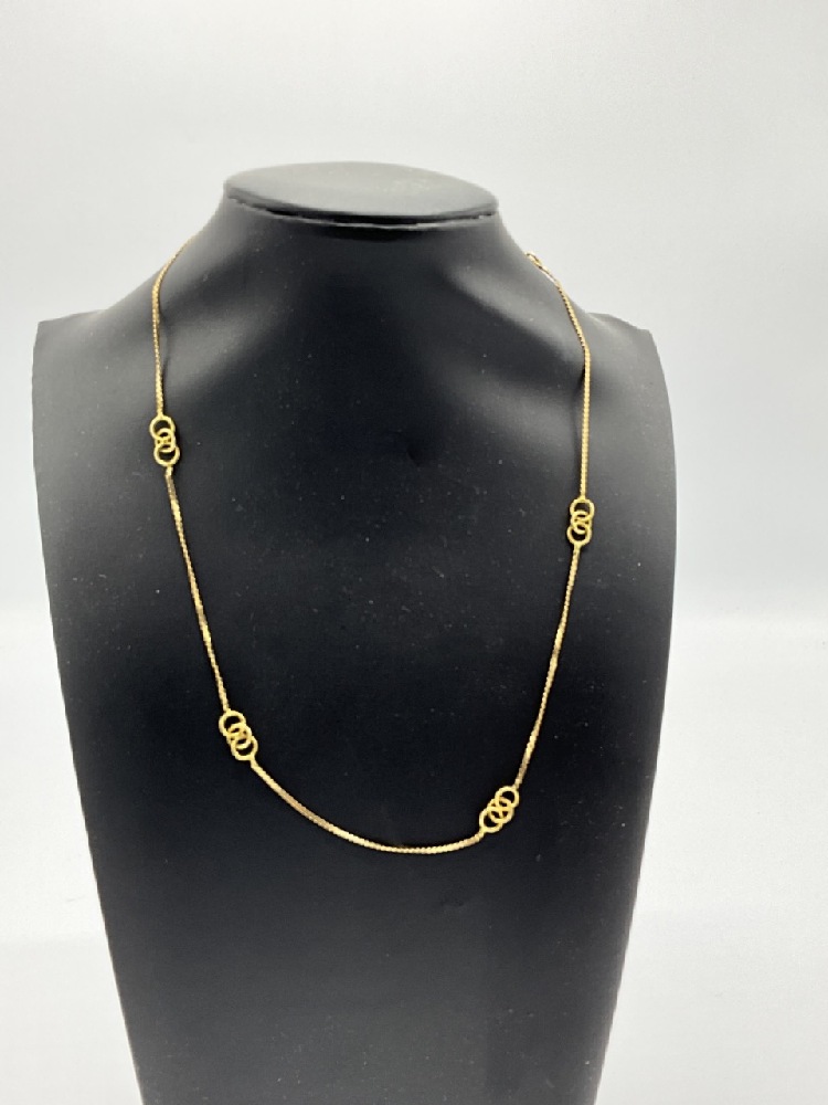 A fine 14k gold lady's necklace with entwined three ring spacers.
