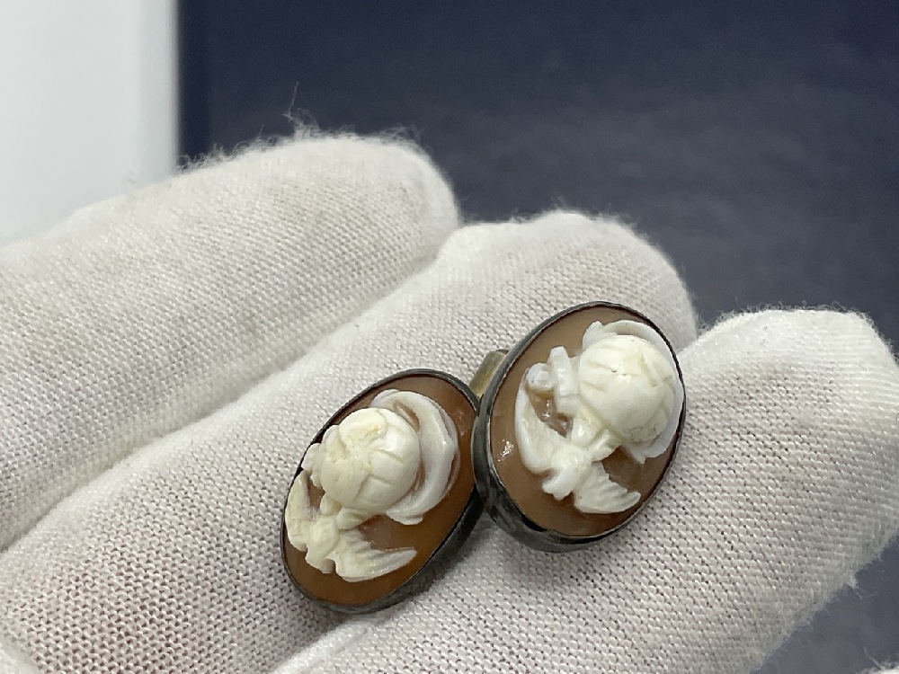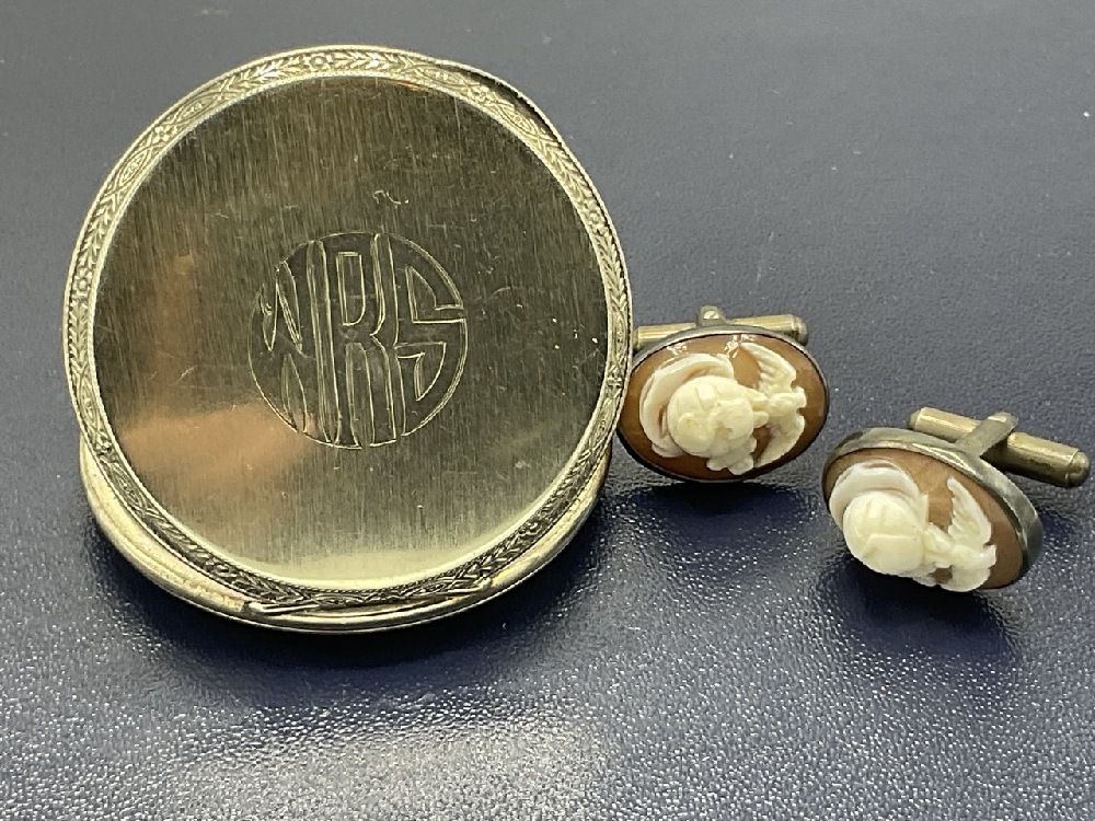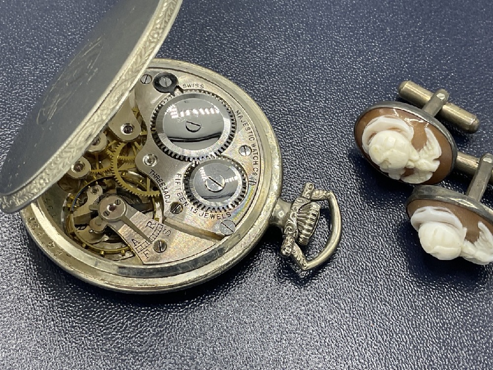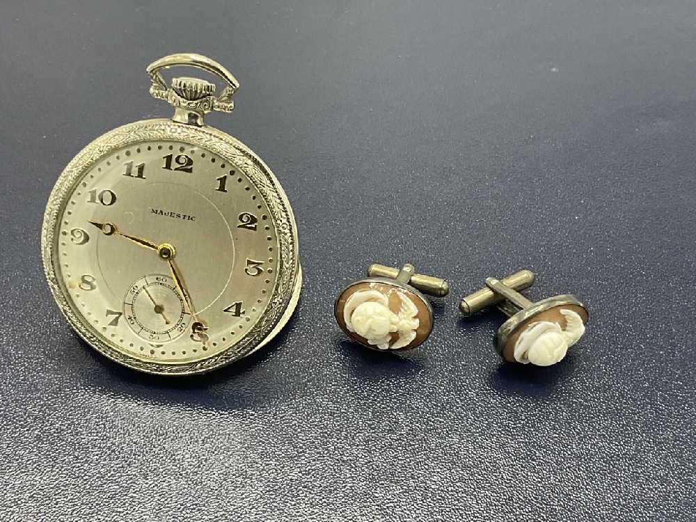 Majestic pocket watch and a pair of cameo silver cufflinks.