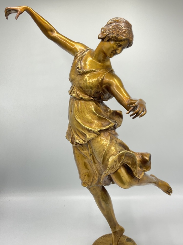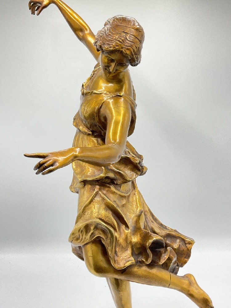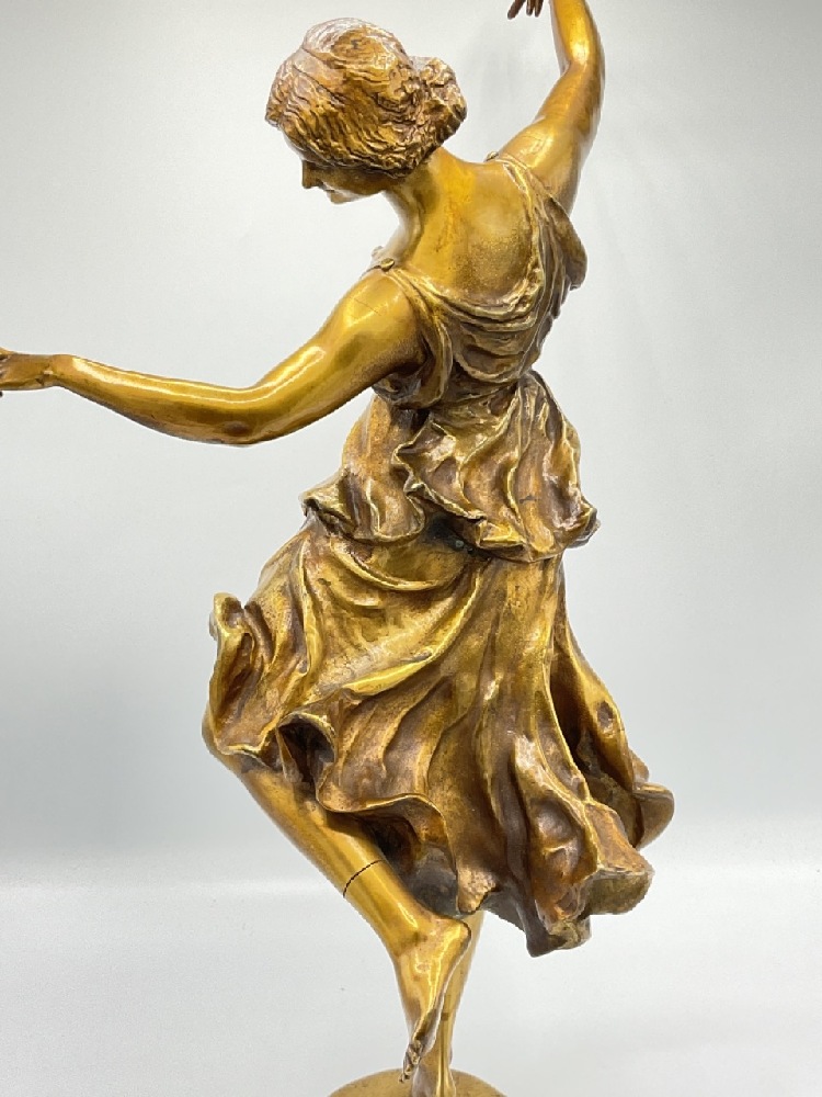 Art Nouveau bronze dancer. Highly detailed with excellent patina. Statue does present a few stress cracks and will need reinforcement/repair.