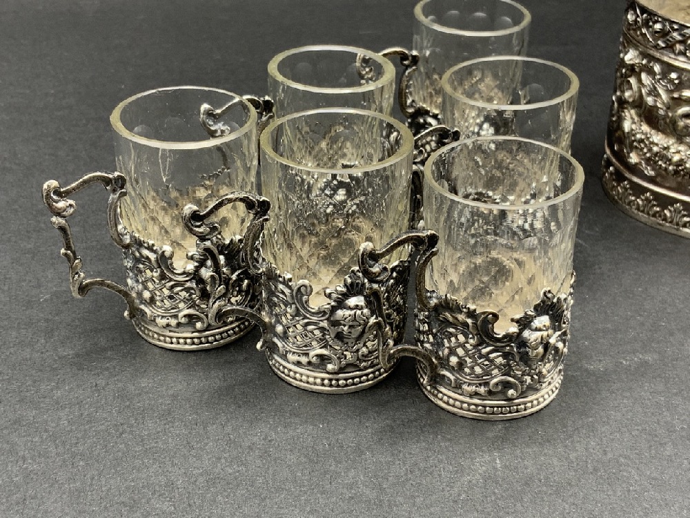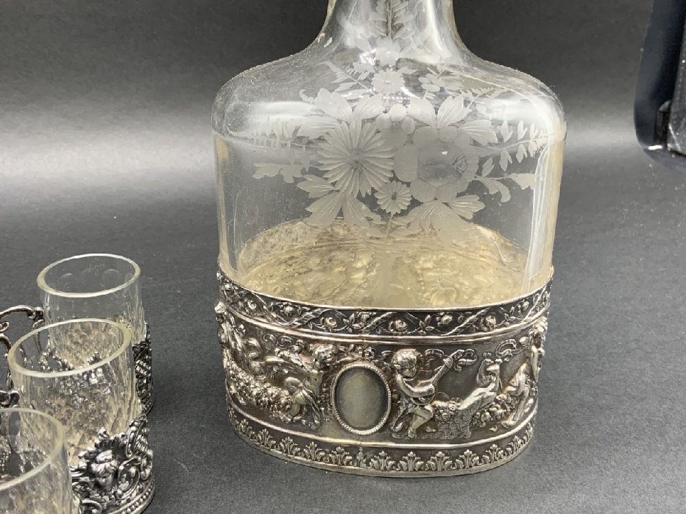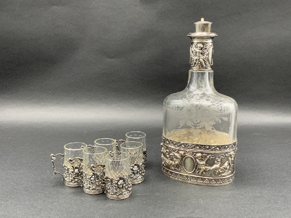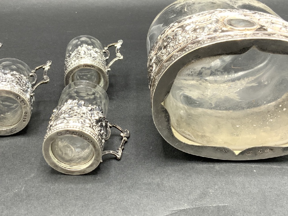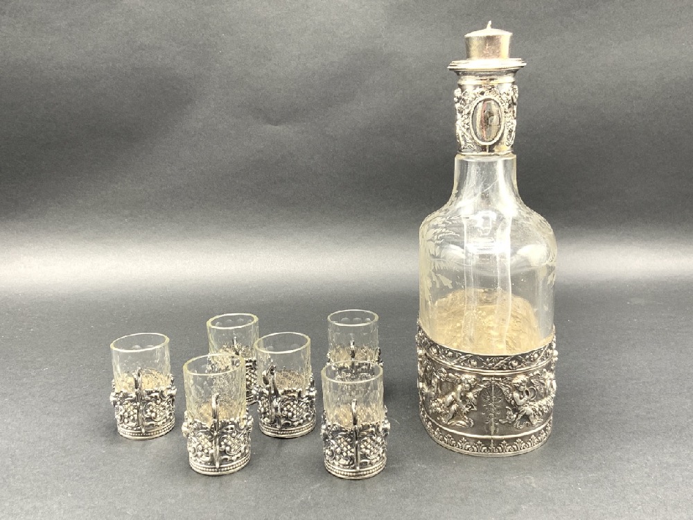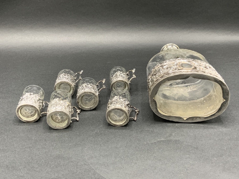 Sterlign Silver Liquor decanter with six cups. Glass with sterling silver overlay.