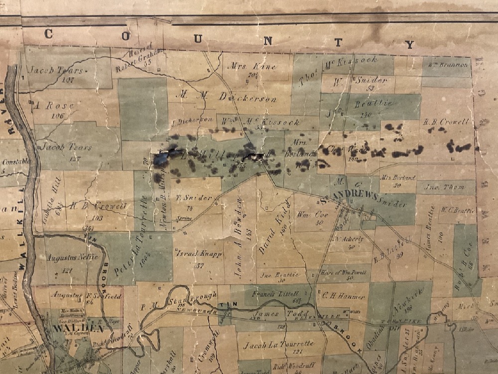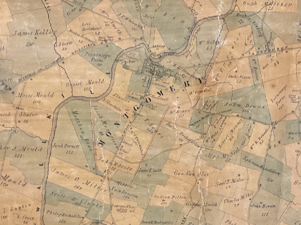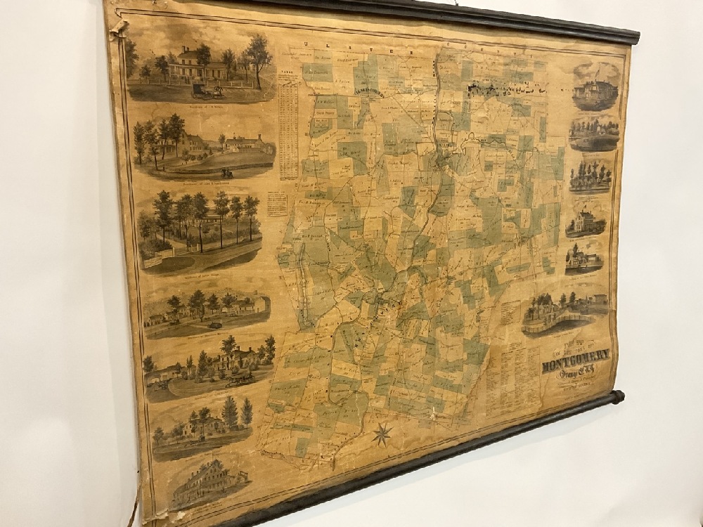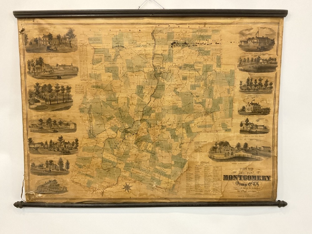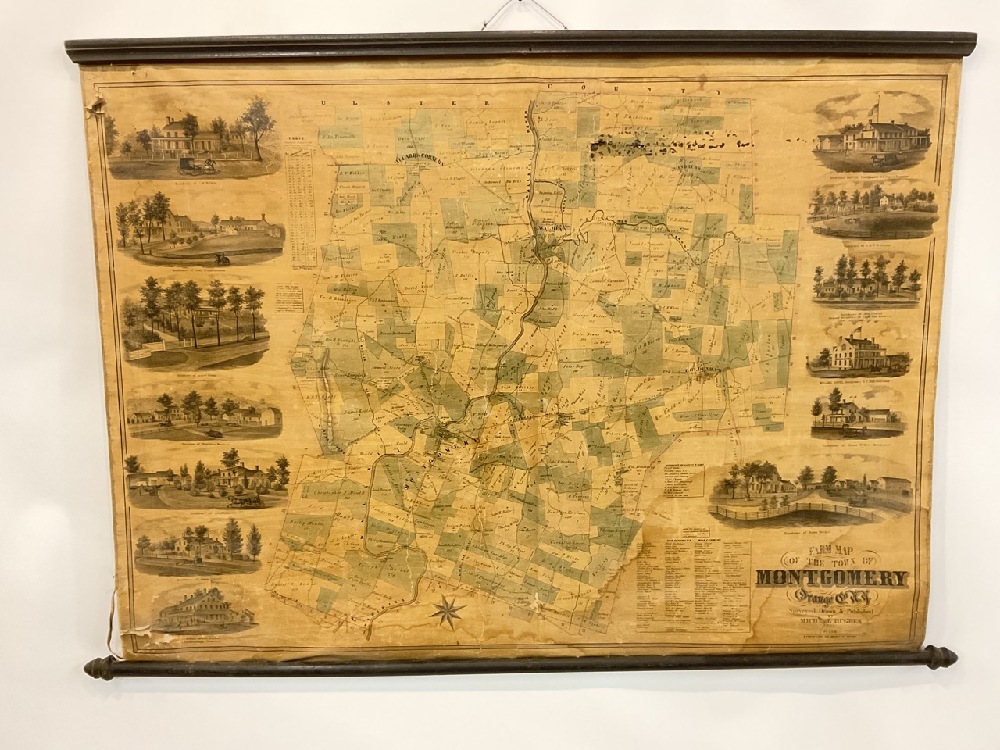 Farm map of The Town of Montgomery, Orange County New York. Surveyed, Drawn and Published by Michael Hughes in the year 1862. The wall map overall is good with oxidization and water staining and small holes. Overall presents well with original holder.