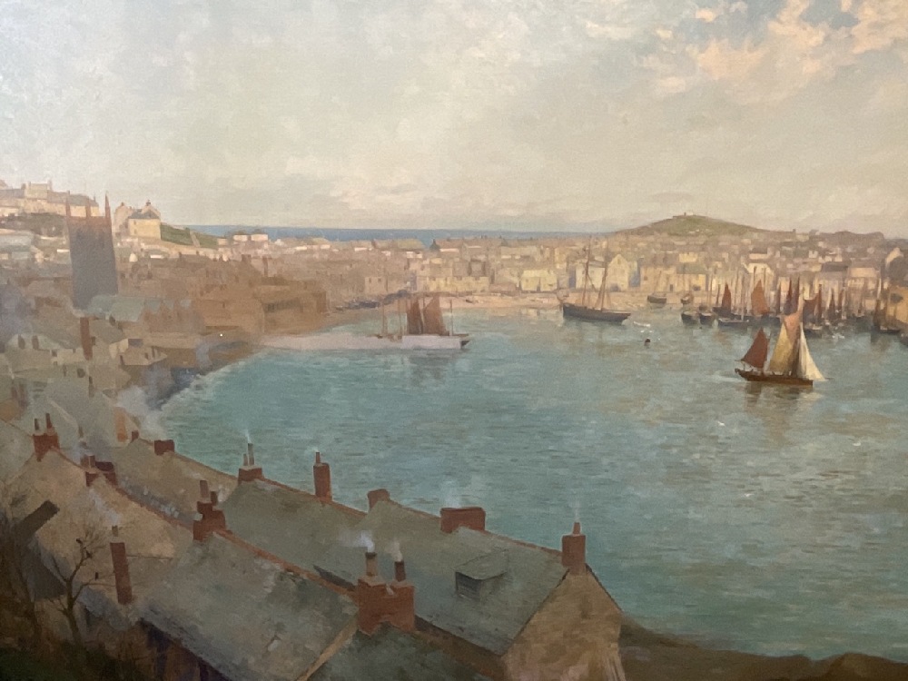 Edmund G. Fuller (English, 1858-1940) Titled: St. Ives Harbour Oil on canvas.Dimensions: 47” x 71” and 57” x 81” A fine harbour scene of monumental size housed in a custom frame. Provenance: Richard Green Gallery (label verso)