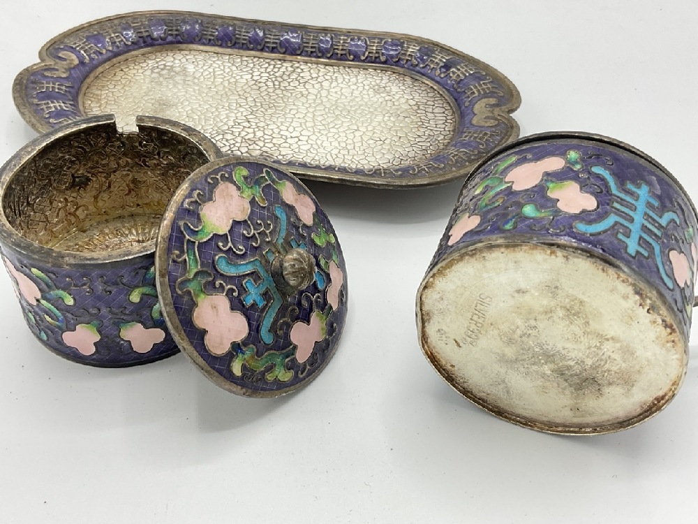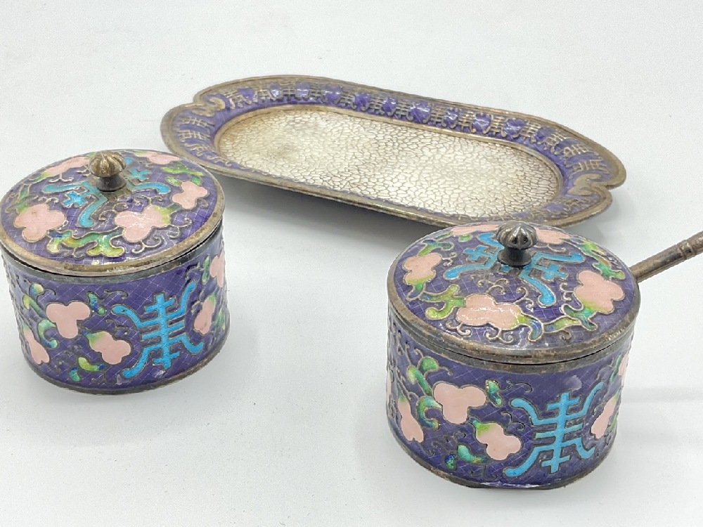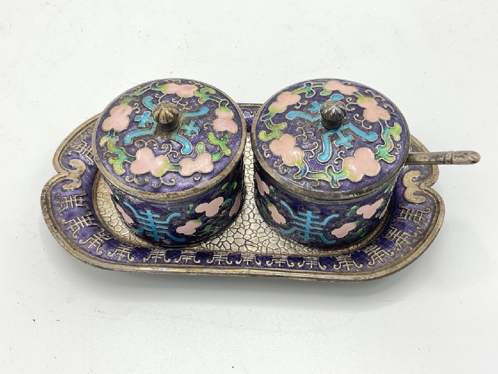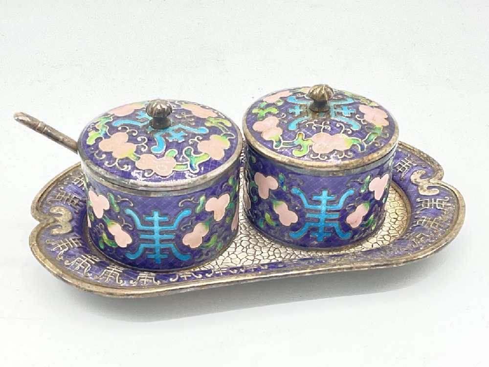 A very fine Korean Enameled condiment set. Two jars with lids and one underplate. One spoon included. Small dents seen at bottom side of one jar. Overall very good. Marked Silver 99% at base.