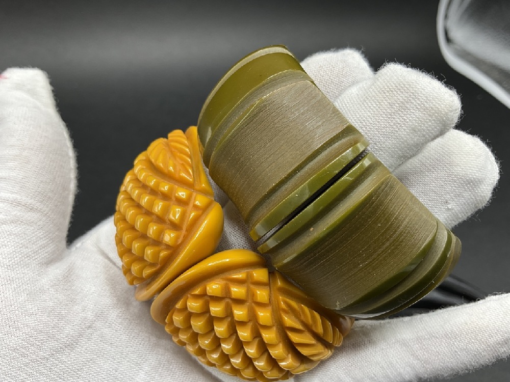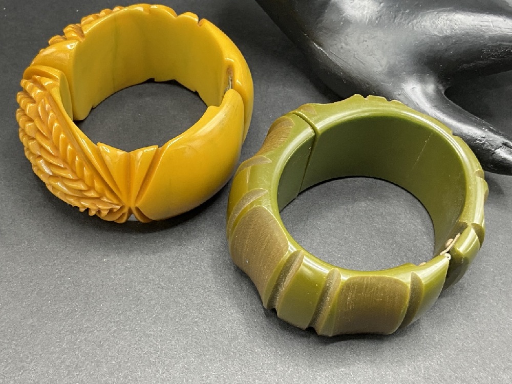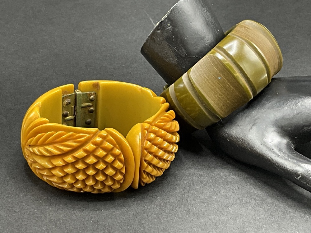 Two (2) Vintage Bakelite Clamper Bracelets. Carved butterscotch and green artichoke.