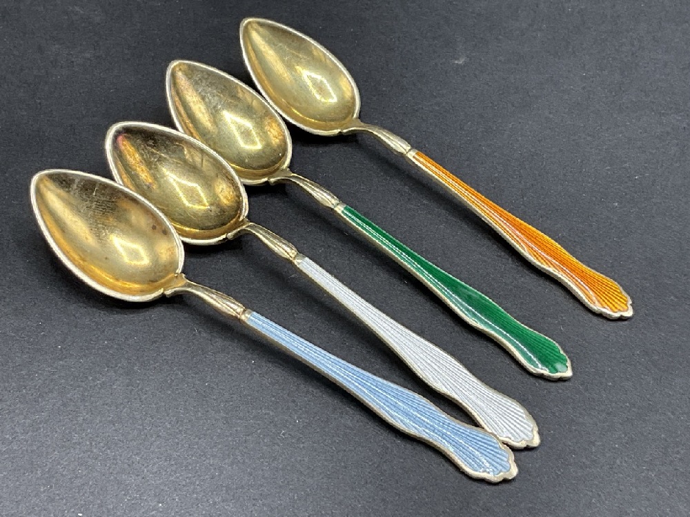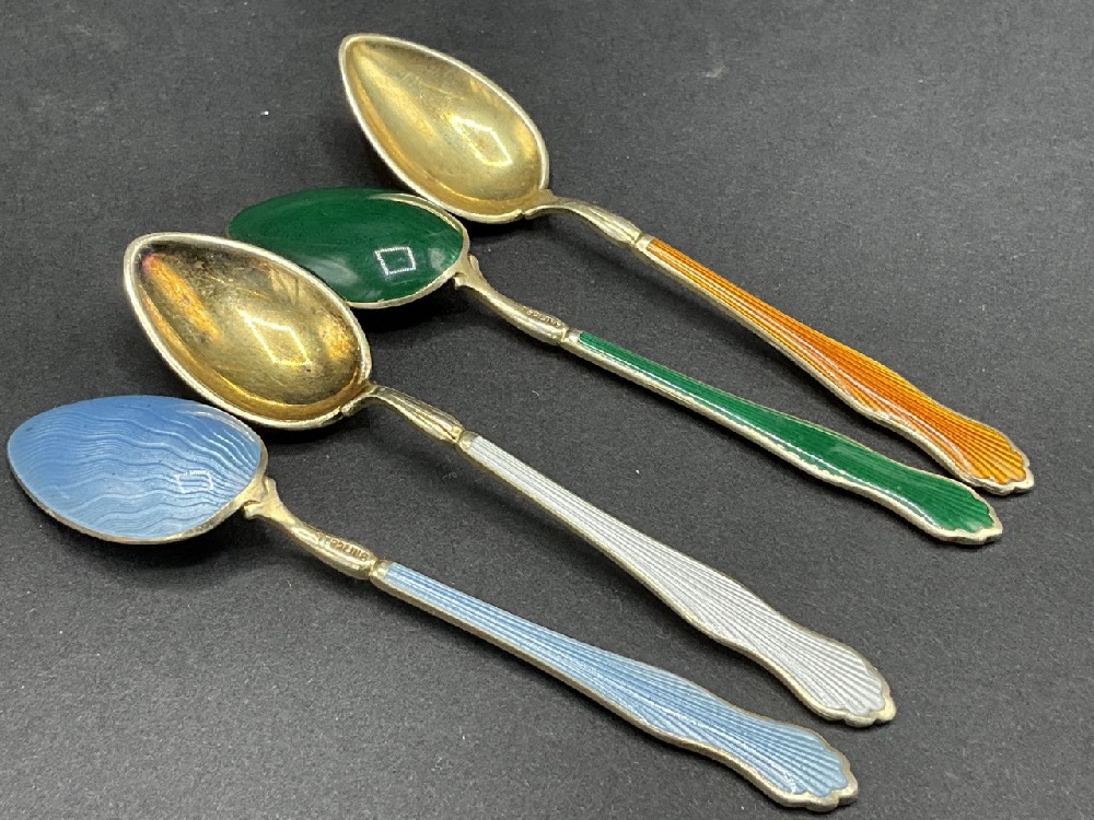 Set of (4) Vintage Sterling Silver Enameled Demitasse Spoons.