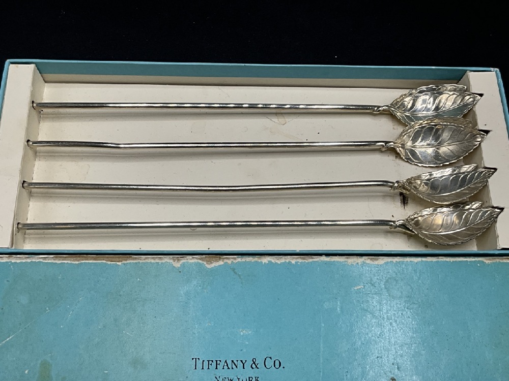 Tiffany and Company Mint Julep ice tea spoons. Quantity 4.Orignal box included. Dimensions: 8 1/2" L Total weight: 1.745 troy ounces