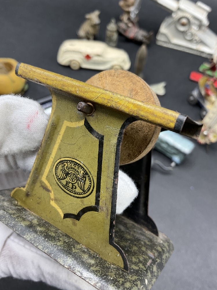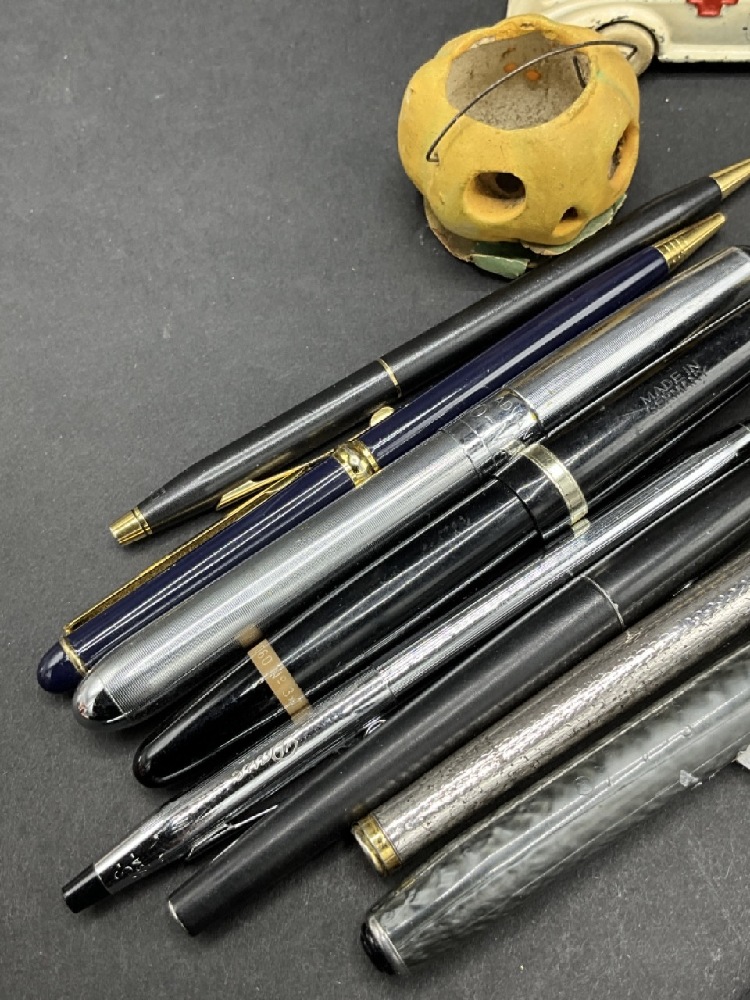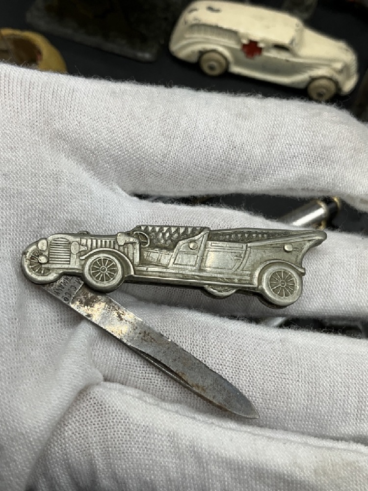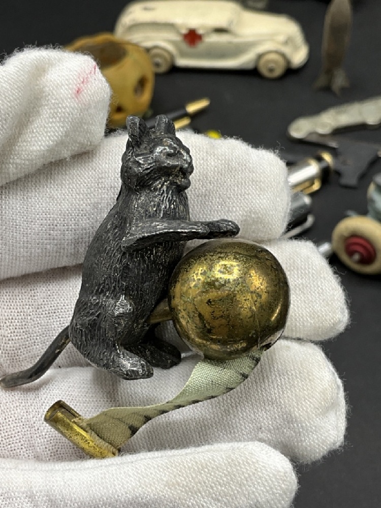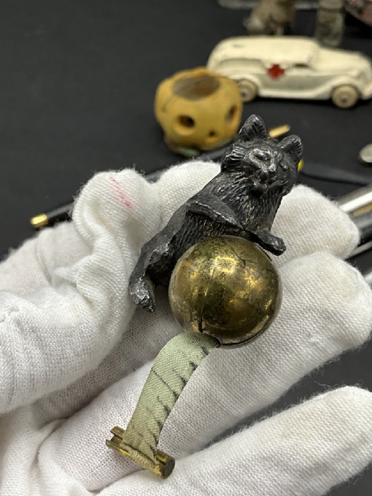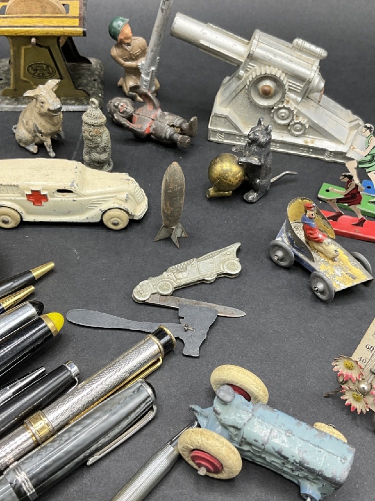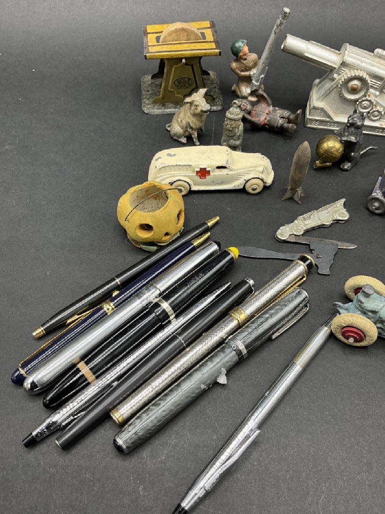 Compiled Curious Lot. German automobile pocket knife, bronze cat and ball sewing tape measure, cannon toys, thermometer, Mini jack-o-lantern, fountain pens, Rapidograph Germany, metalware and more!