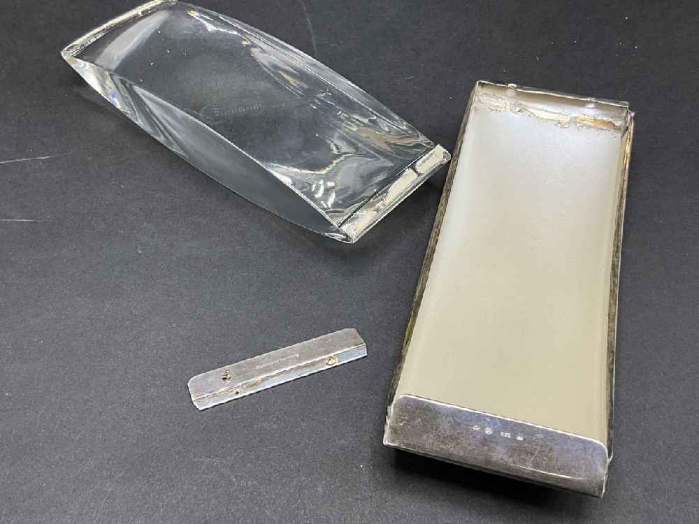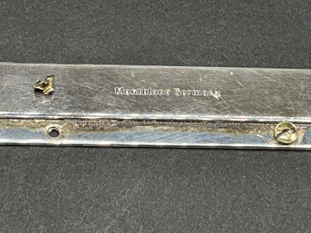 Montblanc Paperweight Desk Blotter. Sterling silver and glass. Small dents noted. Needs repair. Please see photograph preview.