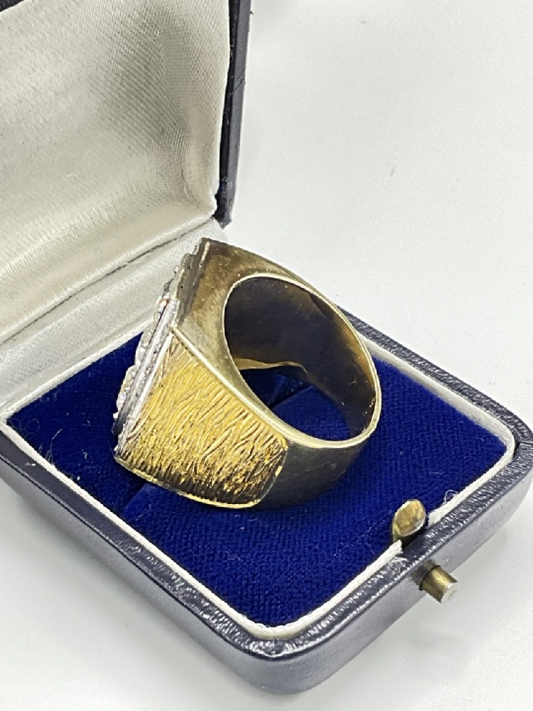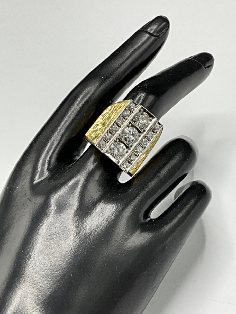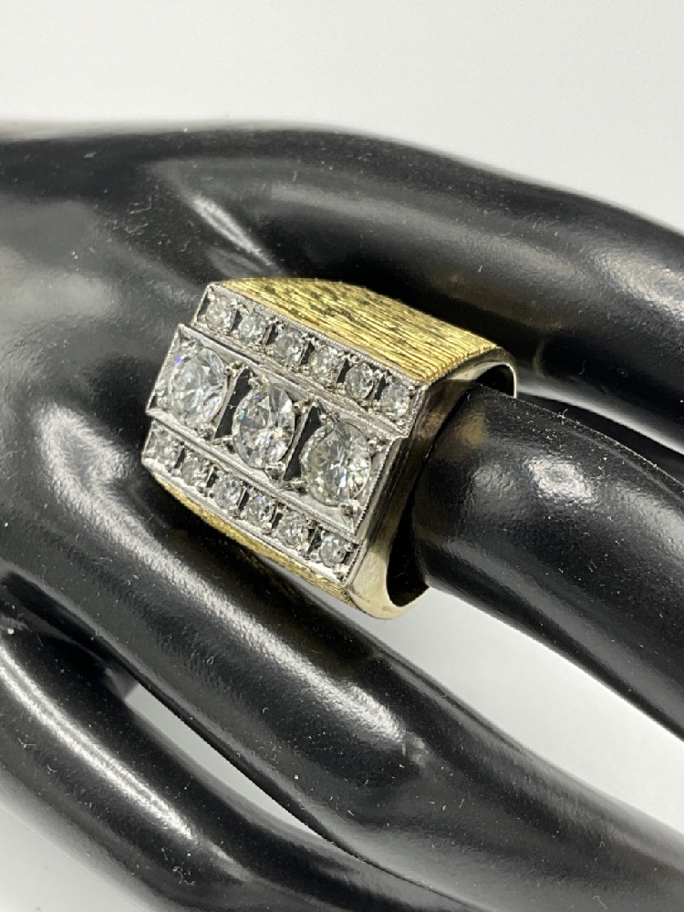 A vintage Men's chunky diamond ring. 10k yellow and white gold with three larger mined diamonds and 12 smaller mined diamonds. All 3 center diamonds have mild blue fluorescence. Total diamond weight 3.20 ctTotal weight: 15.70 grams.