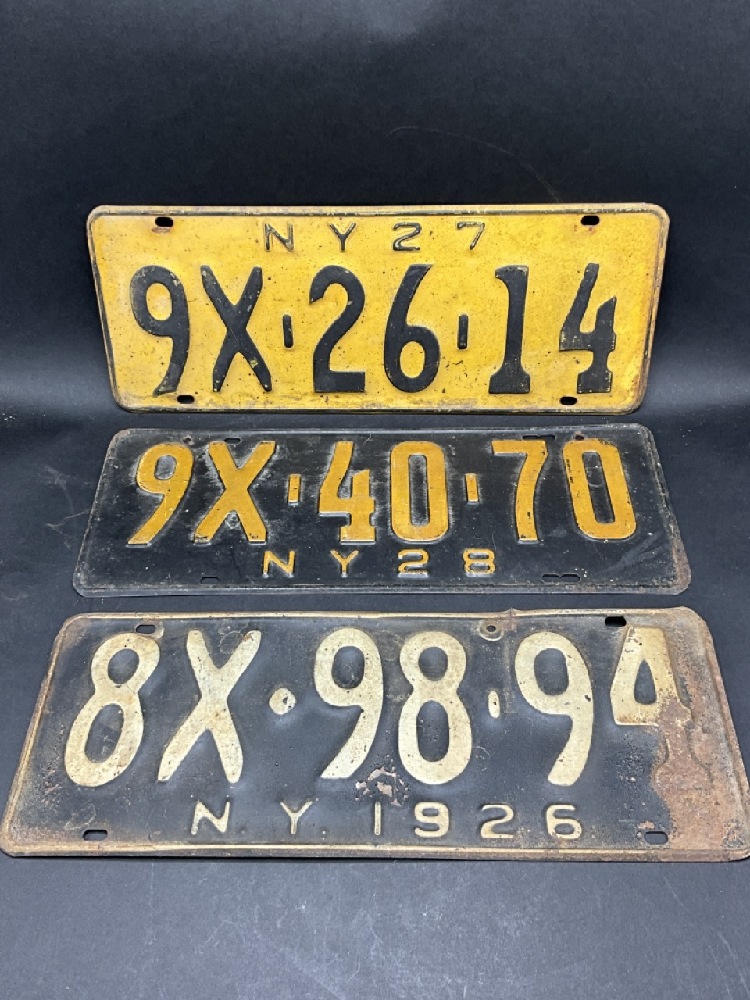 Vintage NY License Plates including 1926,1927,1928, 1939 and 1939 N.Y World’s Fair.