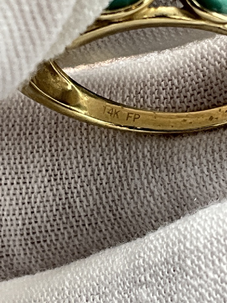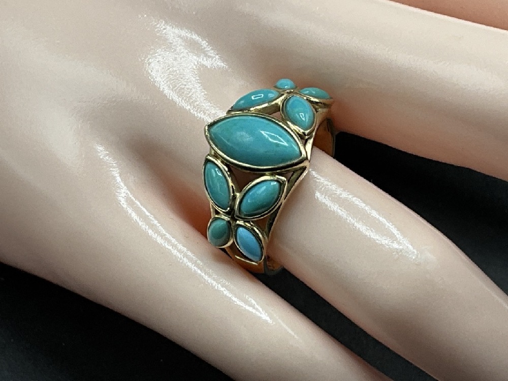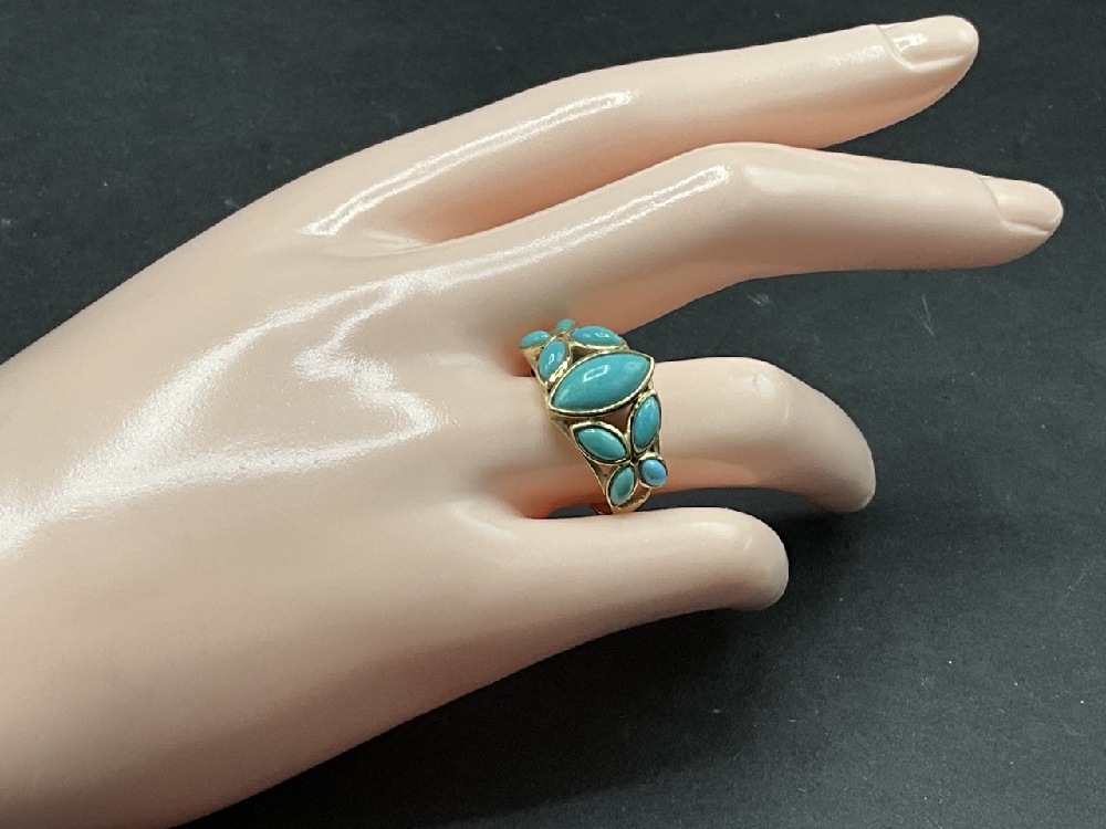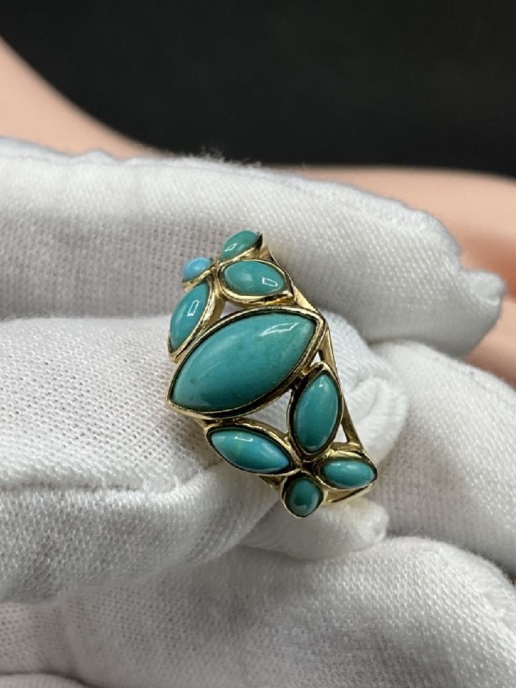 14K gold Chinese lady's ring with fine Persian turquoise stones.