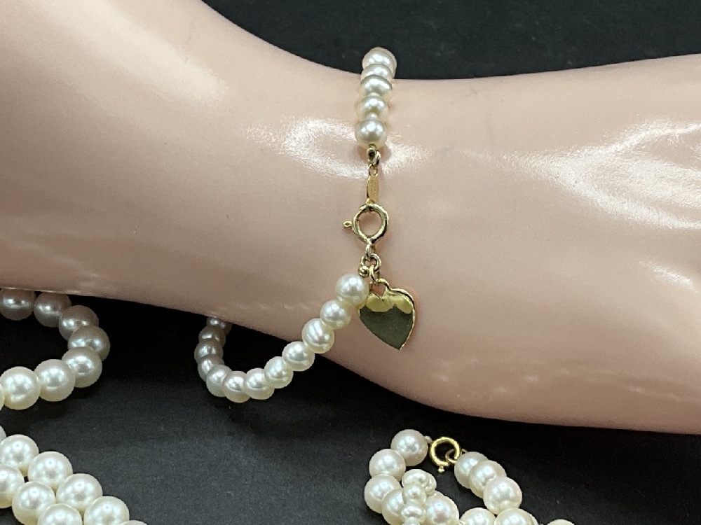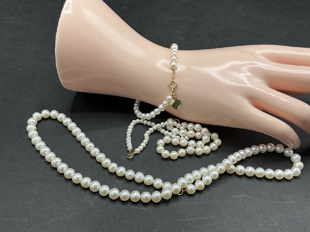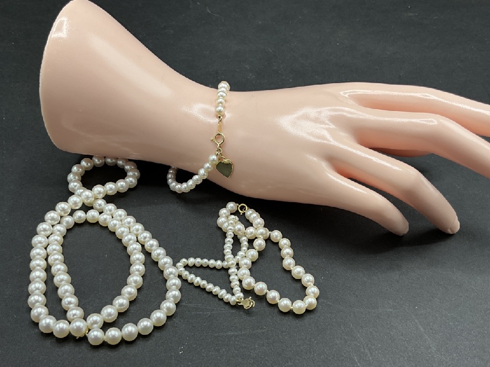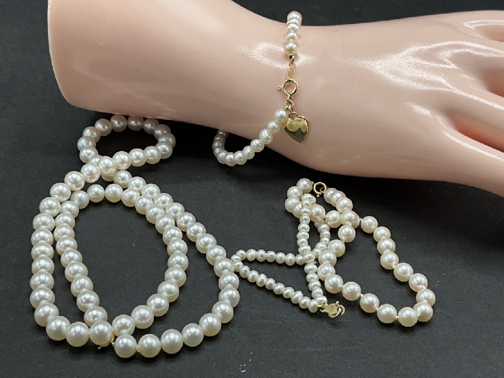 Freshwater pearl bracelets and necklace with 14K gold clasps.