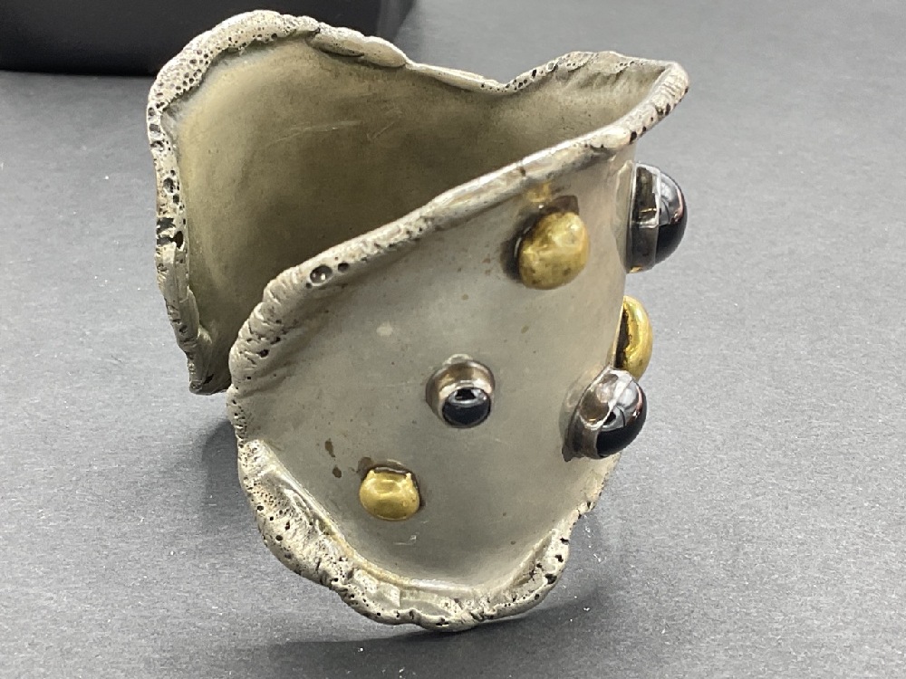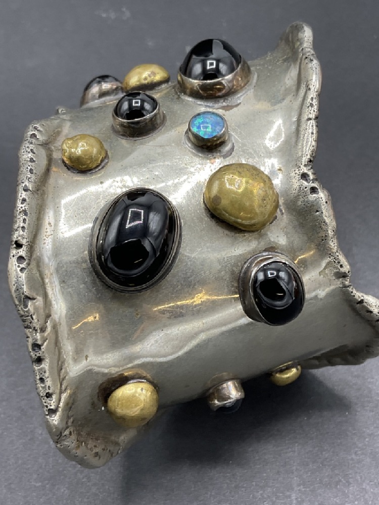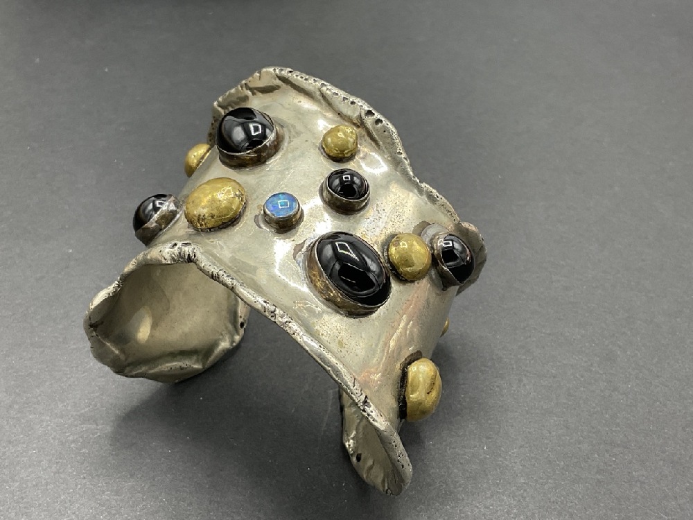 1970 Signed Wolf Desch Artisan cuff bracelet. Silvertone with brass, onyx and opal double.