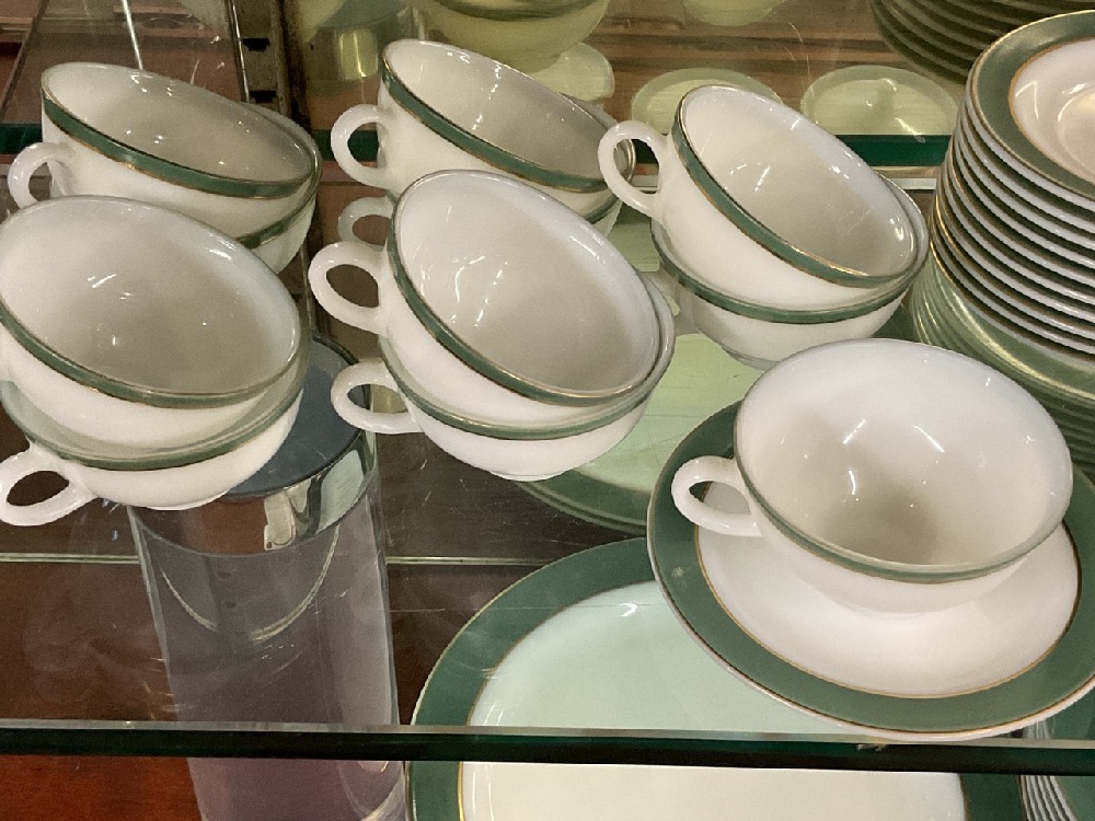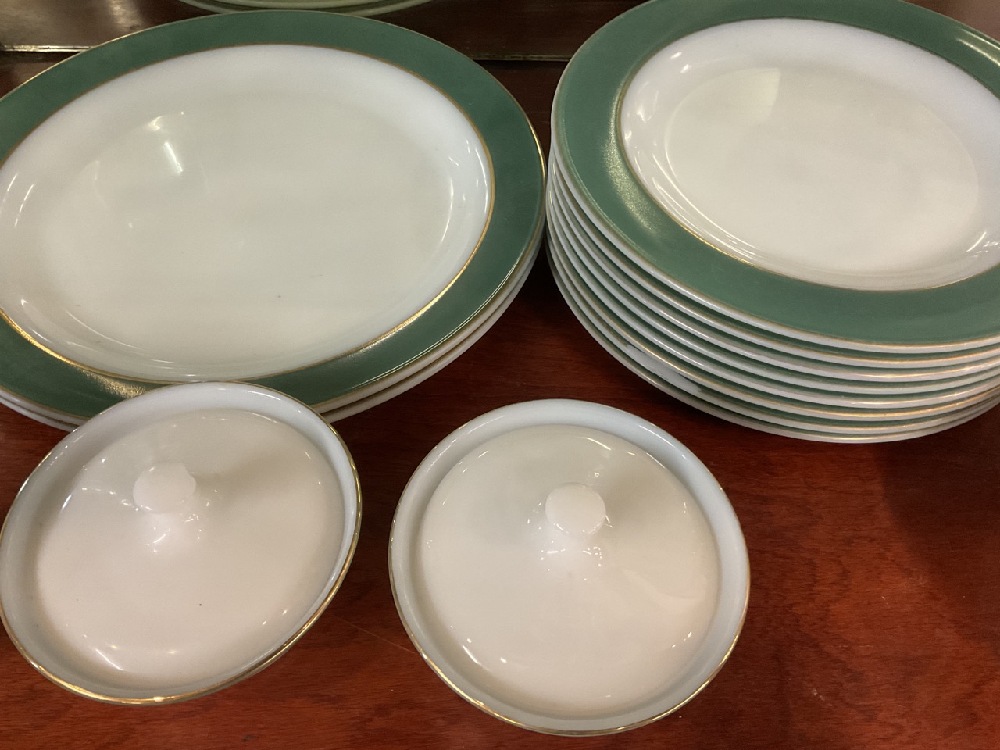 A vintage Pyrex dinner ware service. Glass plates with green border. As seen in photograph preview.