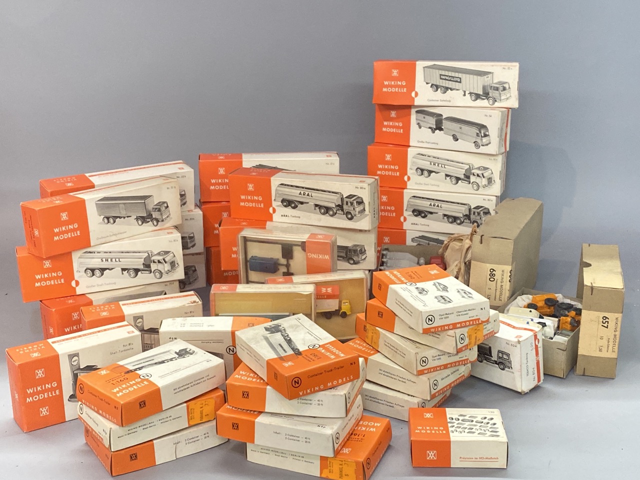 50 pieces total new old stock train set up vehicle models. Trucks, cars etc. 1:87 HO scale and 1:160 scale. Made In Germany.
