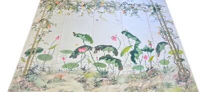 Five Chinese Chinoiserie hand painted watercolor wallpaper panels. Depicts an active live garden scene with blossoming Lotus, caterpillars, grasshoppers, butterflies and framed surround of bamboo trees in landscape. Stamped reverse Made in Hong Kong. Each panel numbered 1-5.