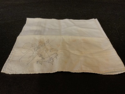 Autographed Liberace Handkerchief with Smeared Makeup. Estate find. Descendants story claimed he wiped makeup off his face before giving it away. Comes with pictures of the 4/28/1984 event, including a picture of him holding the handkerchief.