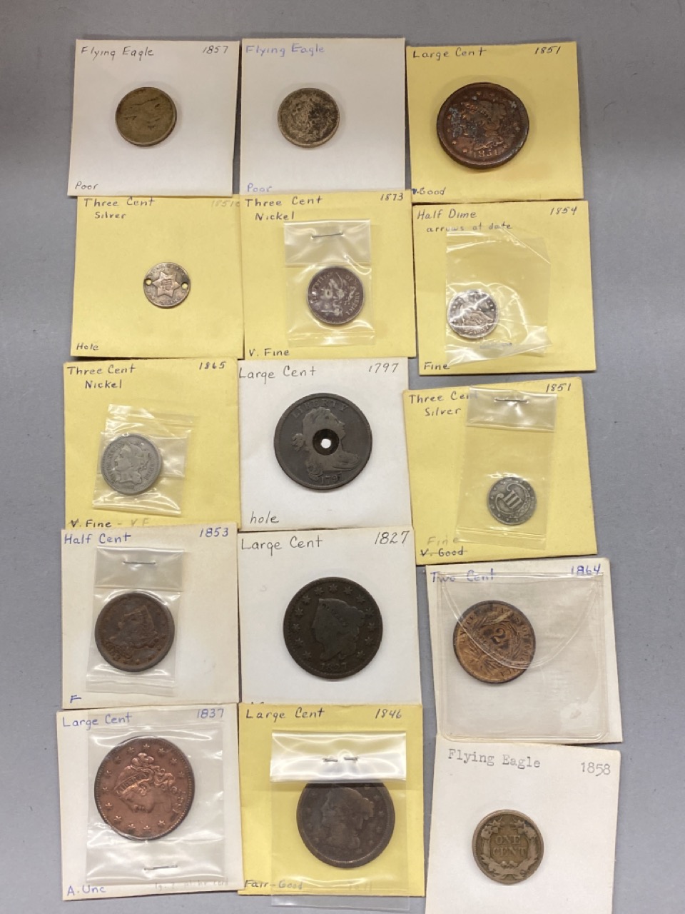 US coin lot from single estate collection including,1858 flying eagle 1864 two cent, 1851 three cent silver, 1854 half dime arrows at date, 1851 flying eagle no date 1873 three cent nickel ,1797 large cent with hole, 1827 large cent, 1846 large cent 1837 large cent 1853 two cent, 1865 three cent nickel, three cent silver and 1857 flying eagle. Please see photograph preview or call.